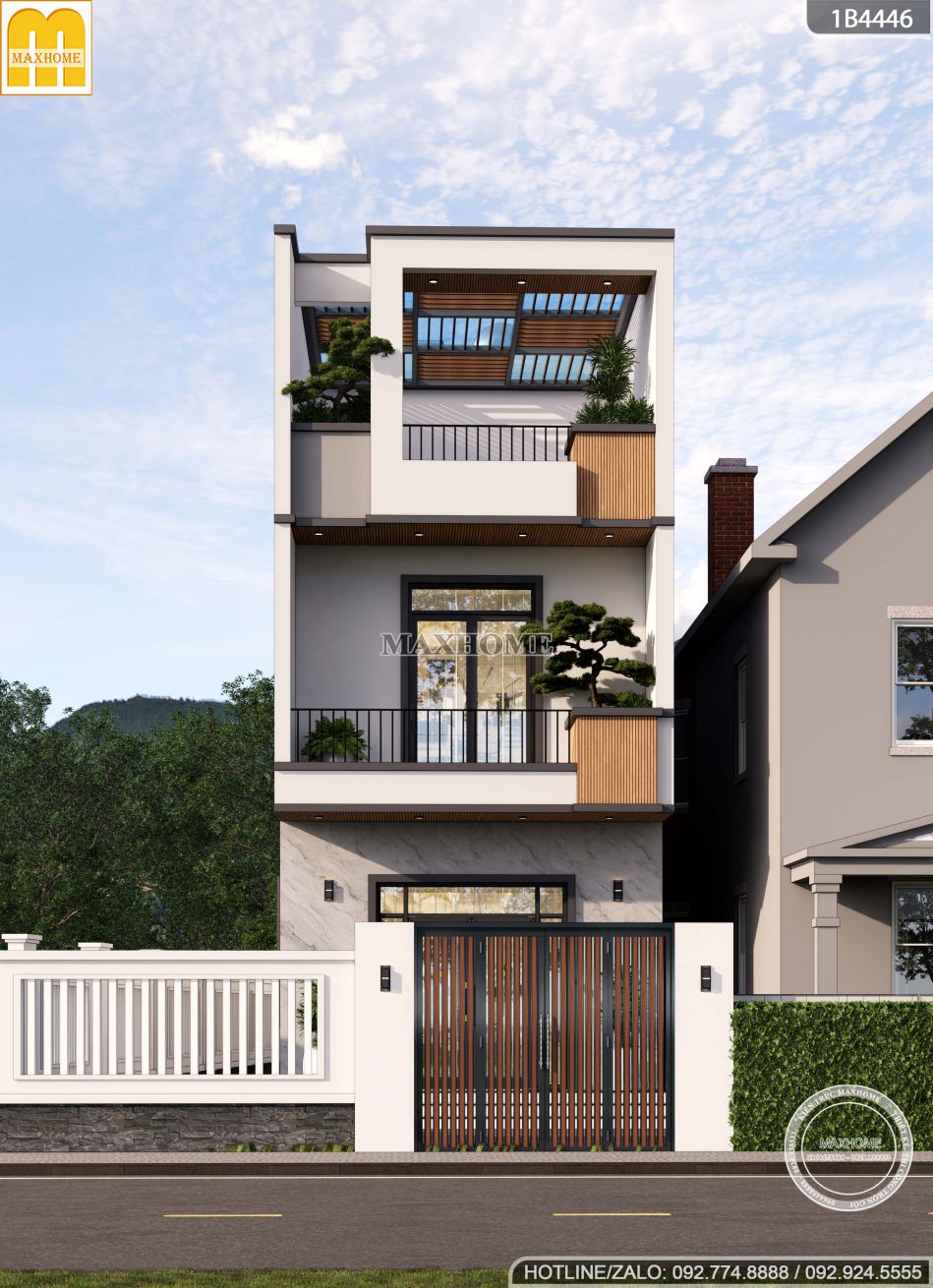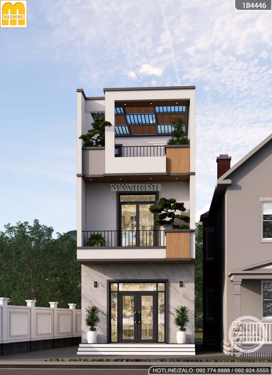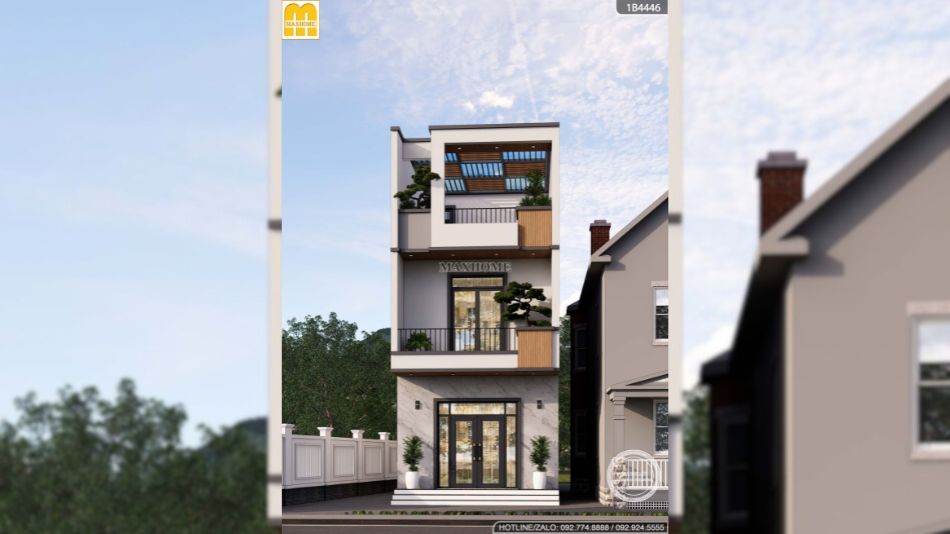 Về vật liệu hoàn thiện, tầng 1 được ốp gạch granite vừa tăng tính sang trọng vừa đảm bảo độ bền và dễ vệ sinh trong quá trình sử dụng. Khu vực tầng 2 và tum được trang trí bằng gỗ nhựa kết hợp bồn hoa xanh mát, không chỉ làm điểm nhấn kiến trúc mà còn góp phần cân bằng không gian, mang lại cảm giác gần gũi với thiên nhiên và nâng cao giá trị thẩm mỹ cho toàn bộ ngôi nhà.