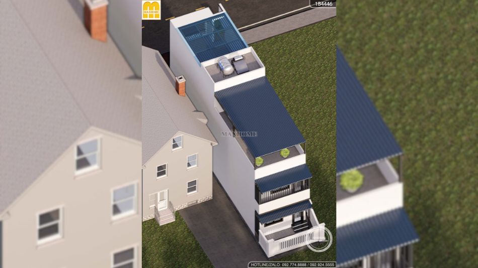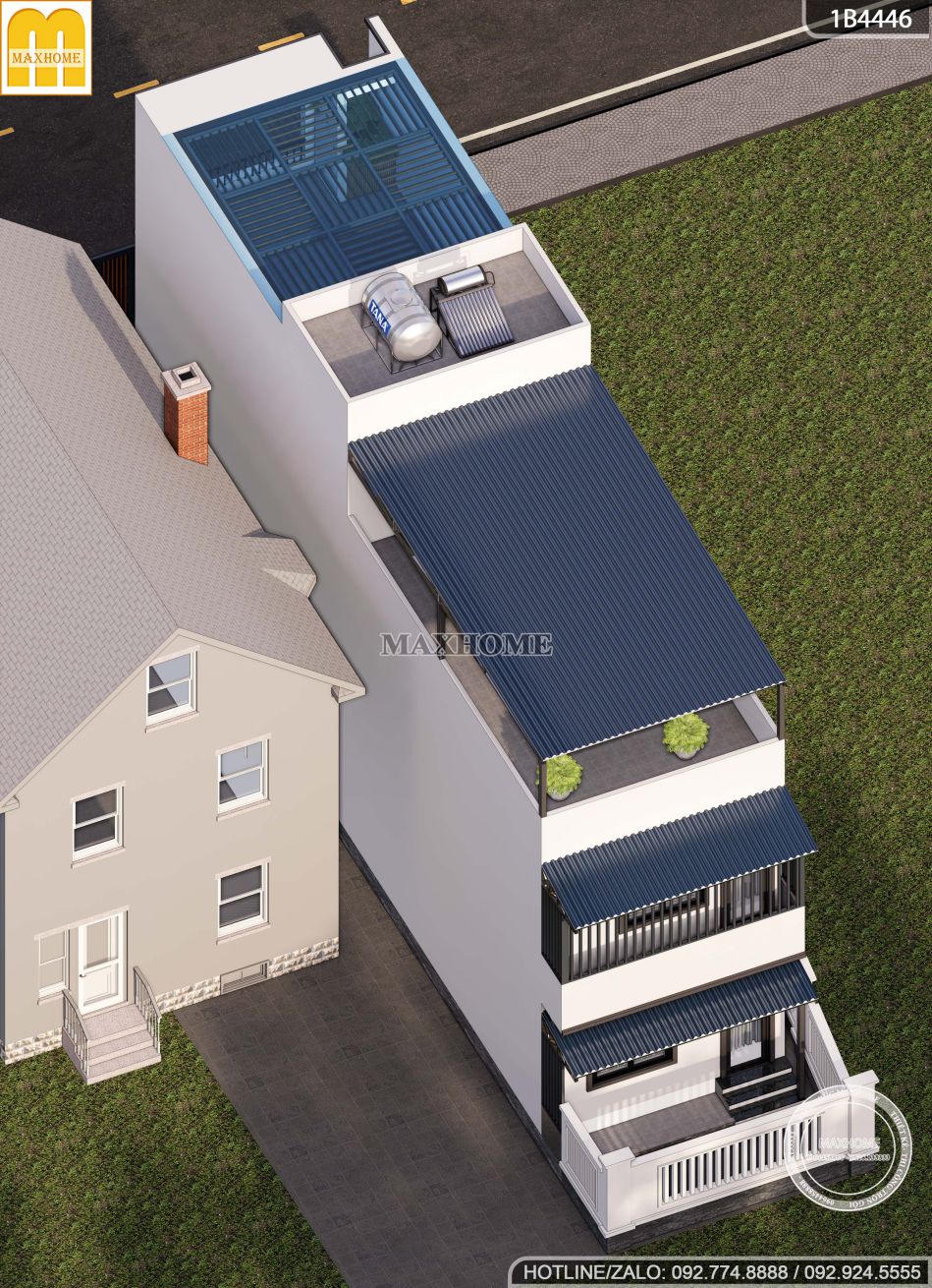 Tại tầng tum, khu vực phía trước được ốp tấm nhựa polycarbonate giúp lấy sáng tự nhiên hiệu quả, giảm hấp thụ nhiệt và bảo vệ không gian bên trong khỏi tác động của thời tiết. Trong khi đó, khu vực sân phơi phía sau sử dụng mái tôn gọn nhẹ, tiết kiệm chi phí, đáp ứng tốt nhu cầu sinh hoạt hằng ngày và đảm bảo tính tiện nghi, thực tế cho công trình nhà phố.