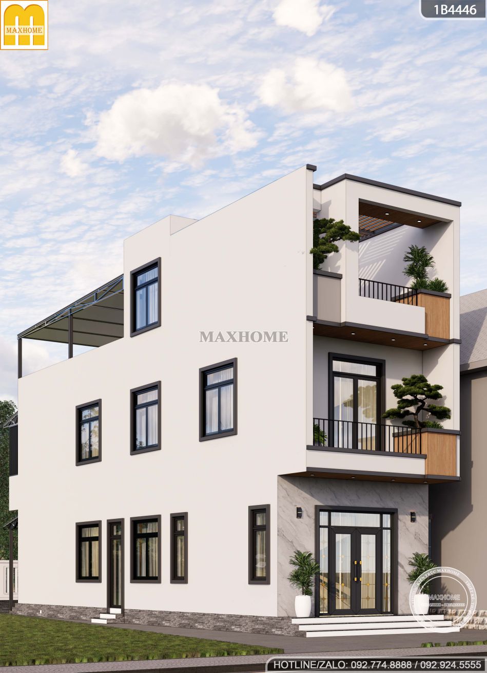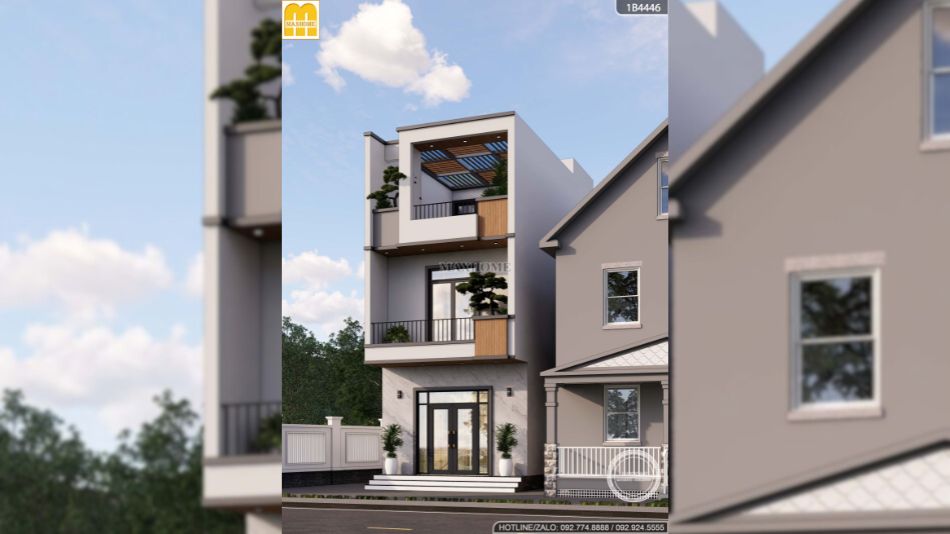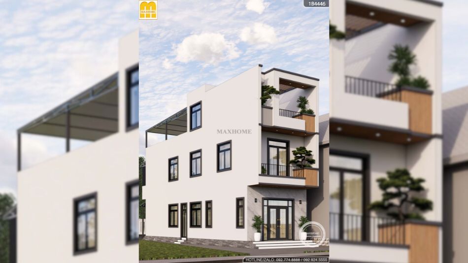 Công trình gây ấn tượng mạnh ngay từ ánh nhìn đầu tiên nhờ ngôn ngữ kiến trúc hiện đại, tối giản nhưng vẫn thể hiện chiều sâu thẩm mỹ. Gam màu trắng được lựa chọn làm tông màu chủ đạo cho mặt tiền, giúp tổng thể trở nên thanh thoát, sáng sủa và dễ dàng thích nghi với cảnh quan đô thị. Điểm xuyết trên nền trắng là màu ghi tinh tế, tạo sự tương phản nhẹ nhàng nhưng đủ nổi bật.