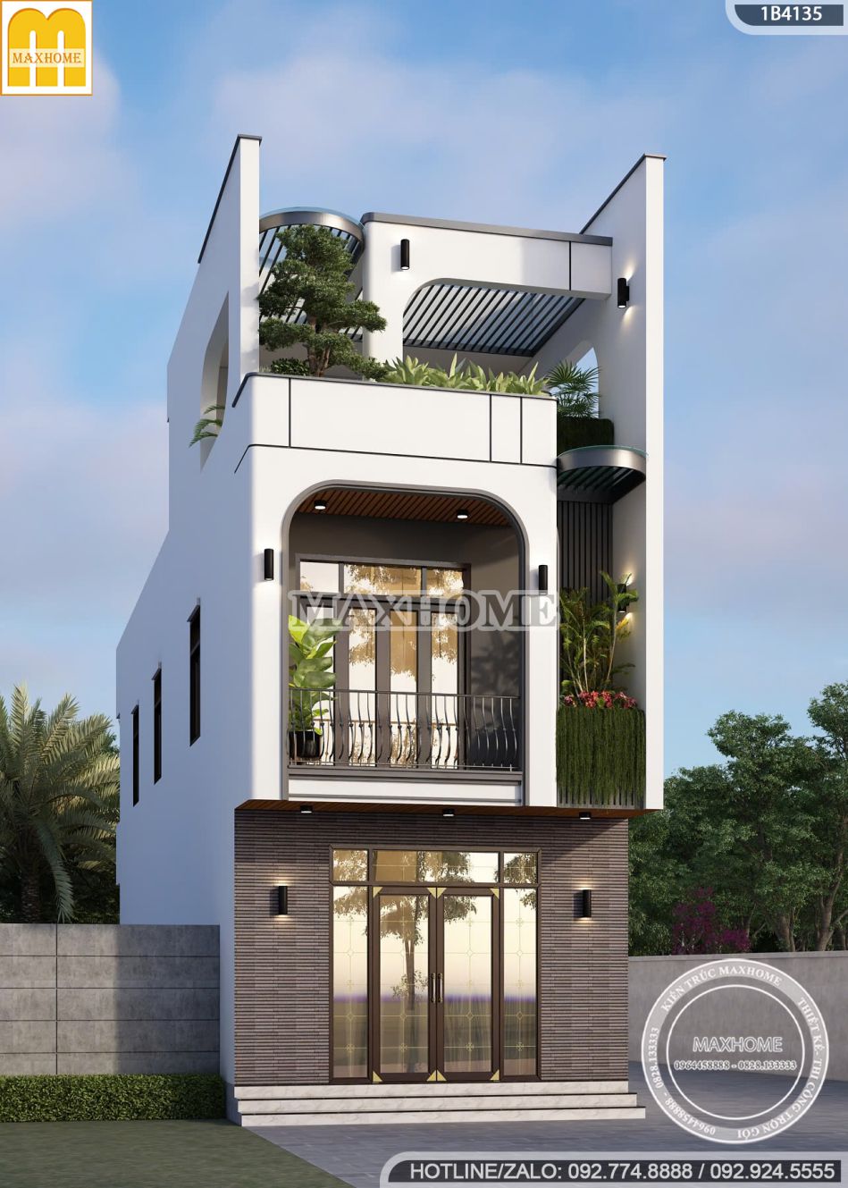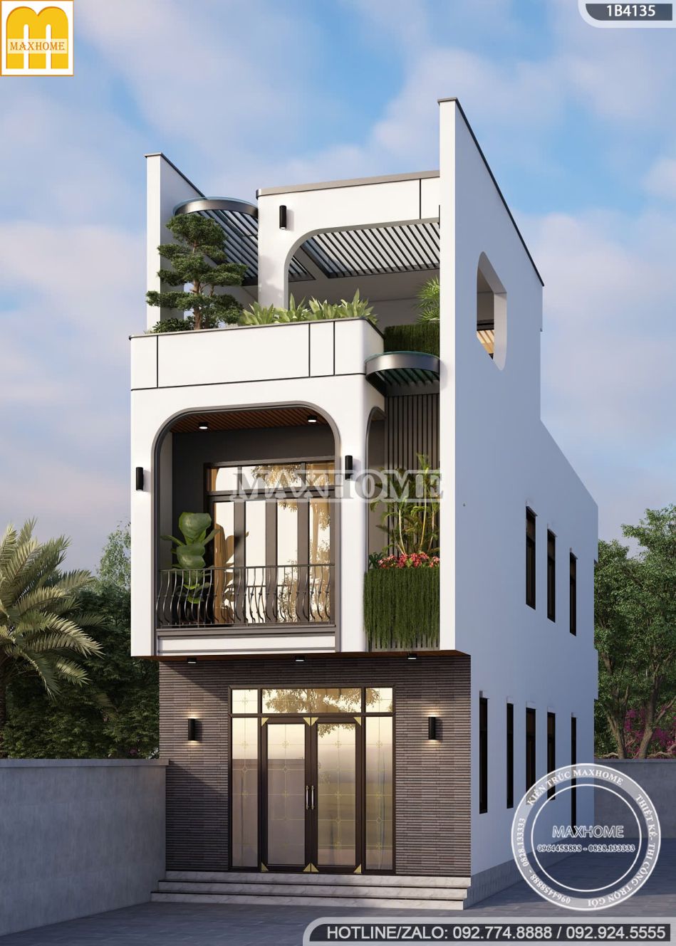 Mẫu nhà phố 2 tầng 1 tum thu hút ánh nhìn ngay từ lần đầu với hình khối kiến trúc gọn gàng, hiện đại nhưng vẫn giữ được sự mềm mại và linh hoạt trong tổng thể. Các đường cong tinh tế tại ban công và viền mái không chỉ tạo điểm nhấn thẩm mỹ mà còn mang lại cảm giác thanh thoát, giúp công trình trở nên nhẹ nhàng và cuốn hút hơn. Đây chính là chi tiết thể hiện rõ tinh thần thiết kế đương đại, tối giản nhưng đầy tinh tế, vừa khéo léo vừa thể hiện được sự sáng tạo của kiến trúc sư.