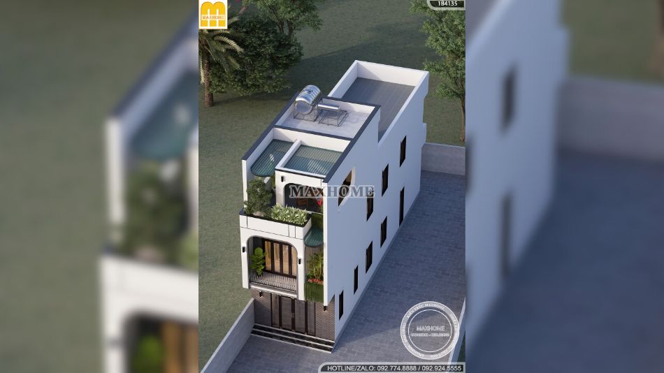 Mẫu nhà phố 2 tầng 1 tum thu hút ánh nhìn ngay từ lần đầu với hình khối kiến trúc gọn gàng, hiện đại nhưng vẫn giữ được sự mềm mại và linh hoạt trong tổng thể. Các đường cong tinh tế tại ban công và viền mái không chỉ tạo điểm nhấn thẩm mỹ mà còn mang lại cảm giác thanh thoát, giúp công trình trở nên nhẹ nhàng và cuốn hút hơn. Đây chính là chi tiết thể hiện rõ tinh thần thiết kế đương đại, tối giản nhưng đầy tinh tế, vừa khéo léo vừa thể hiện được sự sáng tạo của kiến trúc sư.