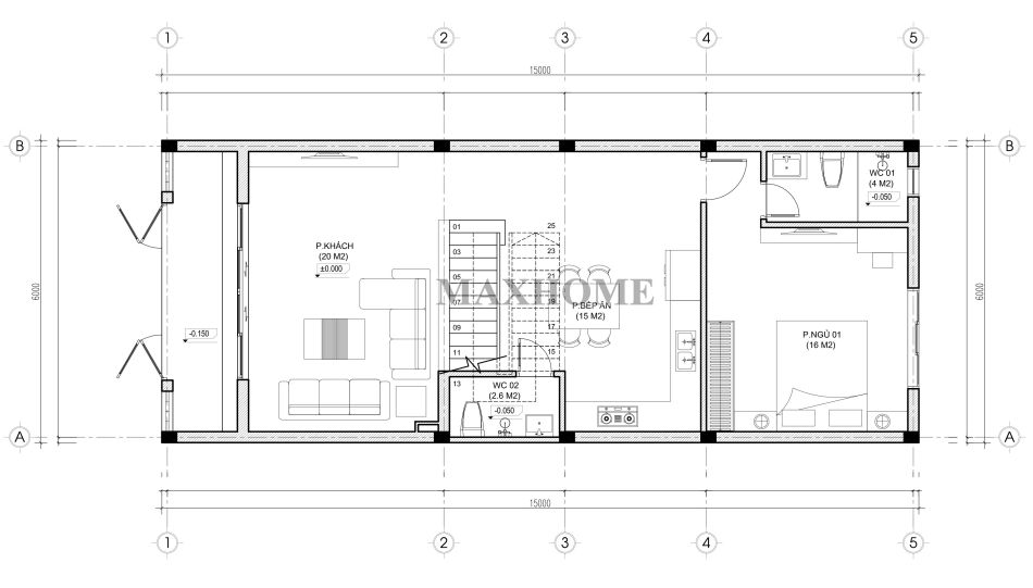Tầng 1: Phòng khách, phòng bếp, 1 phòng ngủ, 2 wc