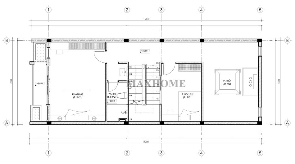 Không gian phòng thờ rộng 21m² được bố trí trang trọng ở phía trước của tầng 2, vừa đảm bảo sự thông thoáng vừa giữ trọn vẻ tôn nghiêm trong đời sống tâm linh của gia đình. Hai phòng ngủ có diện tích lần lượt 21m² và 11m², đáp ứng trọn vẹn nhu cầu nghỉ ngơi riêng tư và thoải mái. Khu vệ sinh chung được đặt ở vị trí giữa tầng đảm bảo sự tiện lợi trong sử dụng.