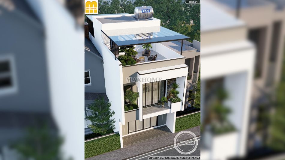 Hệ mái bằng mang đến cảm giác khỏe khoắn, vững chãi, đồng thời giúp tối ưu công năng sử dụng, thuận tiện trong việc lắp đặt tiện ích téc nước và hệ thống thái dương năng.