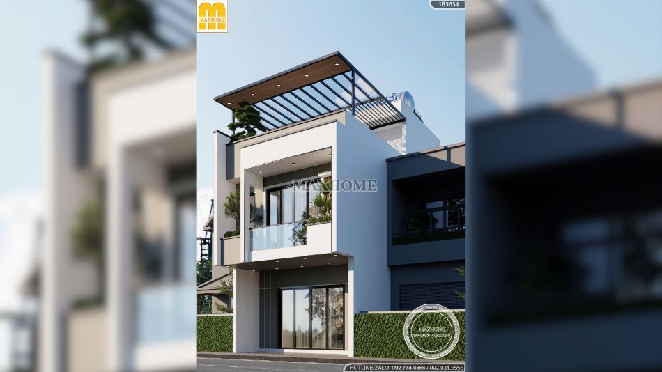 Màu trắng được xem như phông nền trung tính, giúp tôn lên vẻ đẹp của các chi tiết trang trí và mảng xanh trên mặt tiền. Trong khi đó, sắc ghi mang đến chiều sâu, tạo hiệu ứng tương phản nhẹ nhàng giúp hình khối trở nên rõ ràng, mạnh mẽ hơn.
