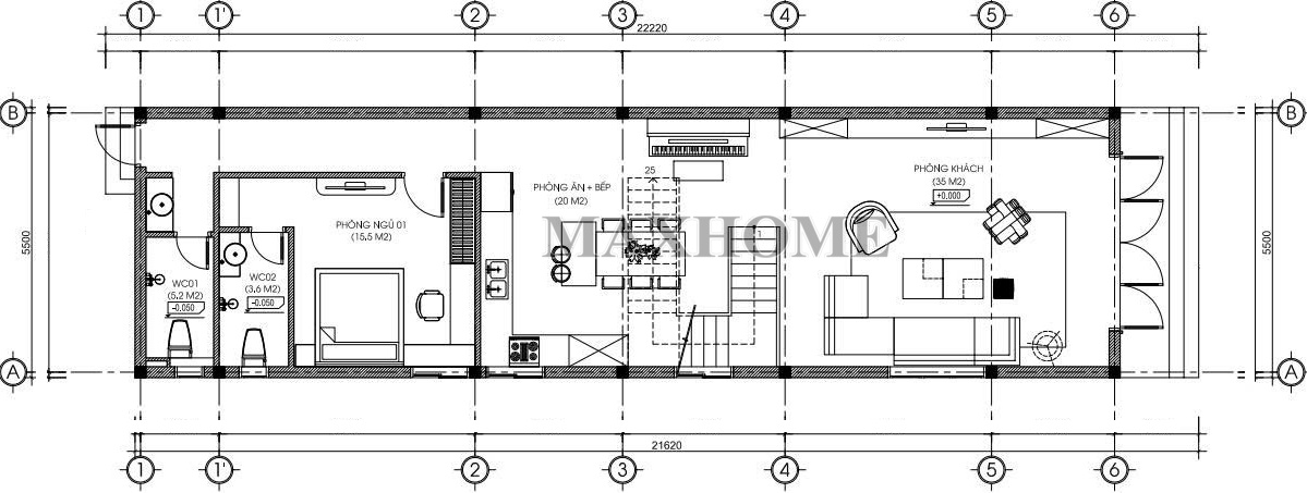 Mặt bằng tầng 1 được thiết kế điển hình với ưu thế về chiều sâu. Mặt tiền khoảng 5,5m và chiều sâu tổng thể khoảng 22,2m. Diện tích rất rộng rãi so với tiêu chuẩn nhà phố, vị trí ngay sau cửa chính, sử dụng hệ cửa 4 cánh lớn giúp đón ánh sáng và gió tối đa cho công trình. Cầu thang đóng vai trò  ngăn cách giữa phòng khách và bếp ăn. Việc đặt cầu thang ở vị trí này giúp tối ưu đi lại sinh hoạt trong gia đình, rút ngắn khoảng cách di chuyển từ các phòng đến lối lên tầng 2. Tầng 1 được bố trí 1 phòng ngủ Master, rất phù hợp cho người lớn tuổi trong gia đình để tránh phải leo cầu thang. Nhà vệ sinh chung được đặt cuối nhà, diện tích khá lớn, có thể tách biệt khu vực tắm và vệ sinh khô/ướt. Lối cửa sau dẫn ra khu vực phụ (có thể là sàn rửa hoặc sân sau), giúp thoát mùi cho nhà bếp và tạo đối lưu không khí xuyên suốt từ trước ra sau.