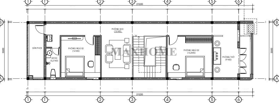 Mặt bằng tầng 2 này được thiết kế tập trung vào sự riêng tư và không gian thư giãn cho gia đình. Với diện tích tương đương tầng 1, các phòng được bố trí rất rộng rãi. Phòng thờ được đặt ở vị trí cao nhất theo đúng phong tục truyền thống, đảm bảo sự yên tĩnh. Phía trước căn nhà được bố trí ban công thông thoáng nhờ giúp căn nhà không bị bí bách. Cả hai phòng ngủ trên tầng này đều có diện tích trên 23m². Điều này cho phép bạn thoải mái bố trí thêm hệ tủ quần áo lớn, bàn làm việc. Ở cuối công trình gia chủ có bố trí 1 khu vực sân phơi, để phơi phóng quần áo tránh mưa gió, bụi bẩn.