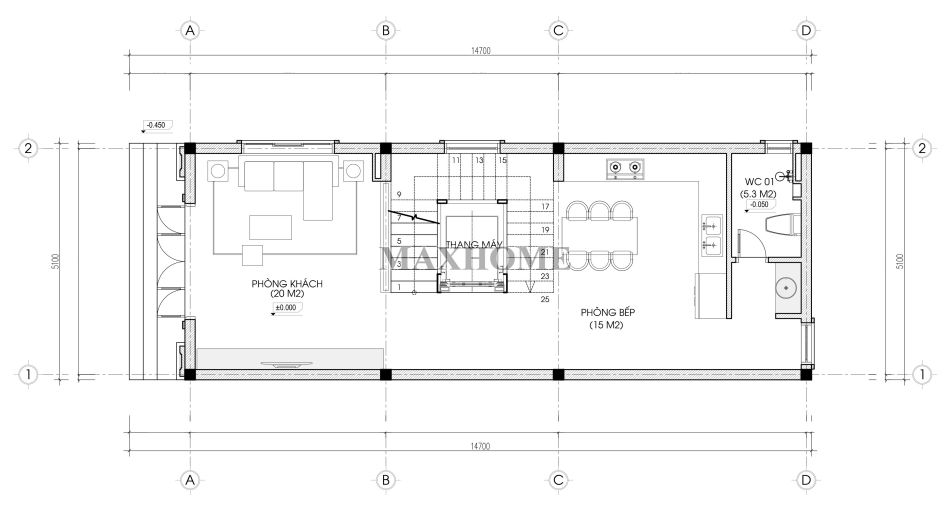 Nhờ lợi thế phát triển theo chiều cao kết hợp cùng sự hỗ trợ của hệ thống thang máy hiện đại, công năng bên trong ngôi nhà được tổ chức khoa học và tối ưu đến từng centimet, mang lại sự thuận tiện tối đa trong quá trình sử dụng hằng ngày. Từ sảnh chính bước vào, không gian phòng khách mở ra rộng thoáng và sang trọng. Qua khu vực sảnh thang đến khu bếp – ăn tiện nghi. Cuối nhà là một nhà vệ sinh chung được sắp xếp hợp lý, đảm bảo sự tiện nghi và thoải mái trong sinh hoạt.