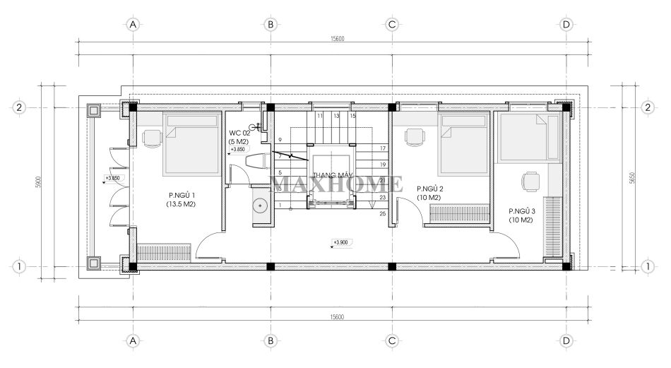 Tại tầng 2, ba phòng ngủ được sắp xếp khoa học, đảm bảo sự riêng tư và yên tĩnh cần thiết cho từng thành viên. Mỗi phòng đều thuận tiện trong việc bố trí nội thất, đồng thời được tính toán hợp lý để đón ánh sáng tự nhiên, mang lại cảm giác thoáng đãng và dễ chịu. Khu vực vệ sinh chung được tổ chức gọn gàng, đặt ở vị trí hợp lý nhằm tối ưu diện tích sử dụng và duy trì sự liền mạch trong sinh hoạt hằng ngày.