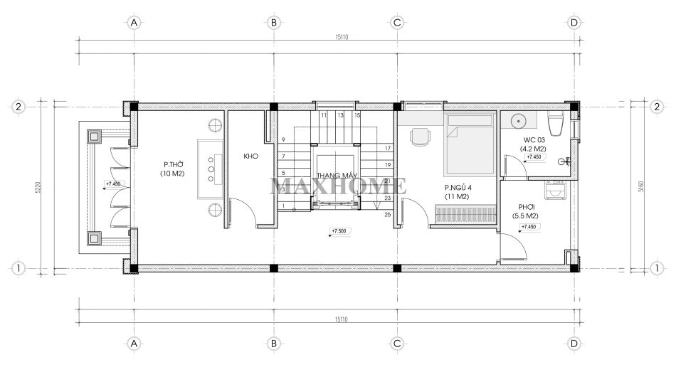 Liền kề phòng thờ là khu vực kho được bố trí kín đáo, thuận tiện cho việc lưu trữ mà không ảnh hưởng đến tổng thể thẩm mỹ. Phía cuối tầng là một phòng ngủ yên tĩnh, kết hợp cùng một phòng vệ sinh chung và sân phơi thông thoáng, tạo nên mặt bằng công năng hoàn chỉnh, đáp ứng linh hoạt nhu cầu sử dụng.