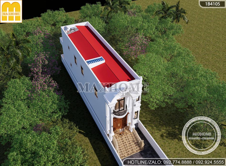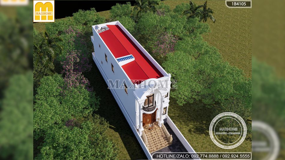 Về vị trí, ngôi nhà phố tân cổ điển nằm theo hướng Tây Bắc, có kích thước xây dựng 6 x 28m. Tổng diện tích sử dụng của công trình sẽ rơi vào khoảng 430m². Công năng các phòng được bố trí khoa học, tiện nghi đáp ứng đầy đủ nhu cầu, mong muốn của chủ đầu tư. Bên cạnh đó, Maxhome cũng rất chú trọng đến yếu tố phong thuỷ phù hợp bản mệnh gia chủ để mang lại những điều may mắn, thuận lợi và một không gian sống lý tưởng cho các thành viên.