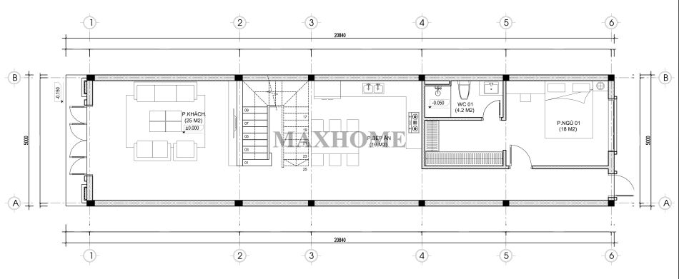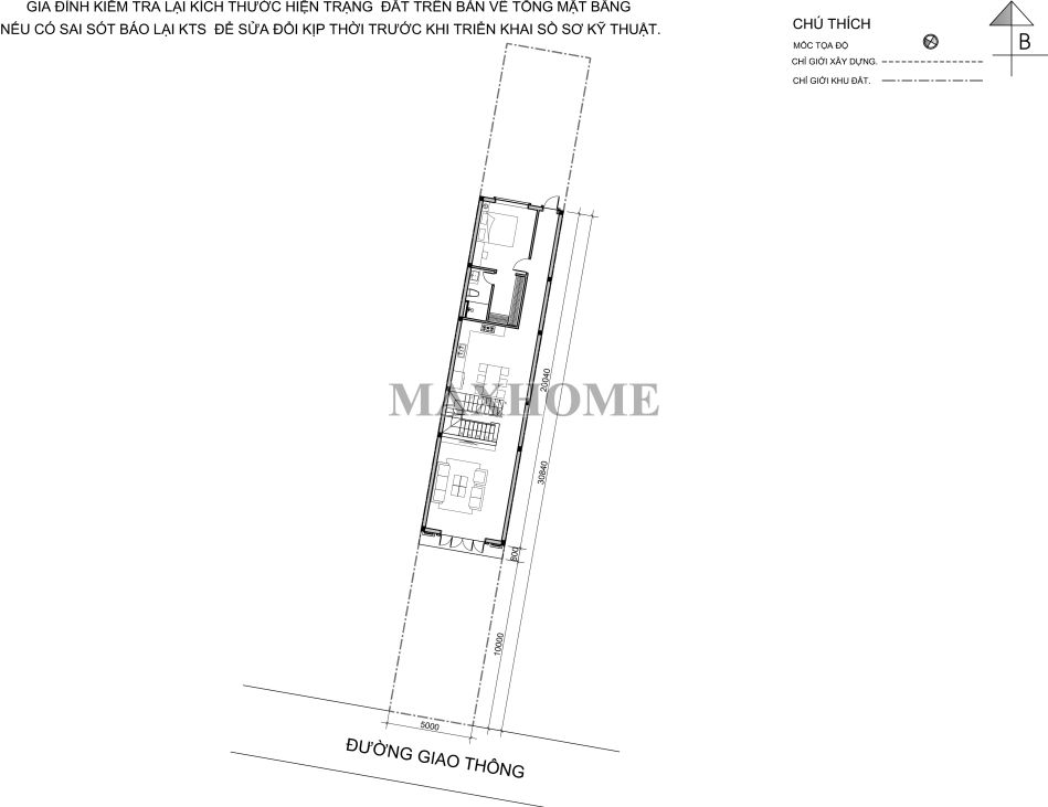 Về vị trí, công trình tọa lạc tại hướng Tây Nam, với kích thước xây dựng 5 x 20,8m và tổng diện tích sử dụng khoảng 245m². Để đảm bảo không gian sống tiện nghi, thoải mái và phù hợp với nhu cầu sinh hoạt của từng thành viên, phương án bố trí công năng được KTS tính toán kỹ lưỡng, dựa trên mong muốn cụ thể của gia chủ và đặc điểm diện tích thực tế.