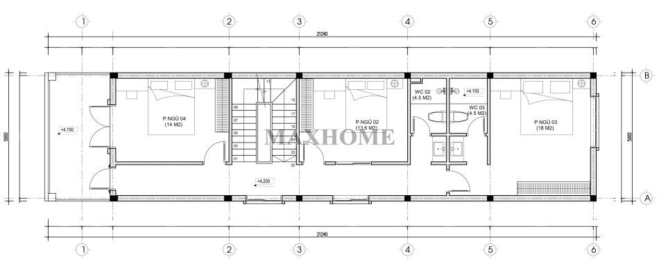 Phía trước nhà là phòng ngủ số 4 rộng rãi, sở hữu lợi thế ánh sáng và gió tự nhiên từ ban công. Phía sau là phòng ngủ số 3 và phòng ngủ số 2, mang đến không gian nghỉ ngơi riêng tư, yên tĩnh cho từng thành viên. Cuối cùng là khu vệ sinh chung bố trí hợp lý giúp thuận tiện trong quá trình sinh hoạt.