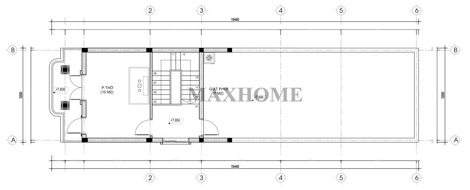 Tầng 2 được quy hoạch công năng rõ ràng, đảm bảo sự tiện nghi và khoa học trong sinh hoạt. Ngay trung tâm mặt bằng là khu vực cầu thang, vừa giúp giao thông thuận tiện, vừa tạo sự cân đối cho tổng thể.