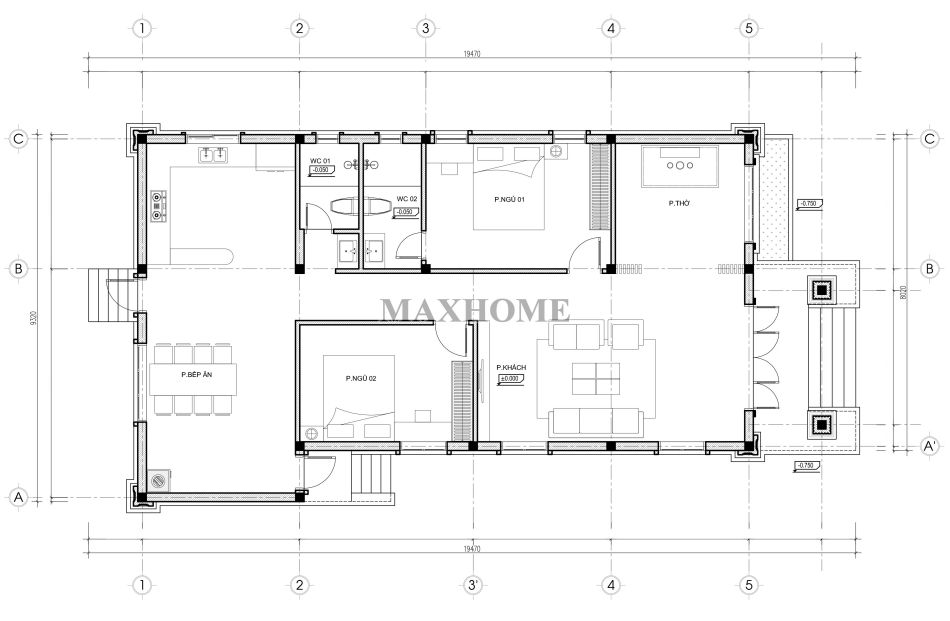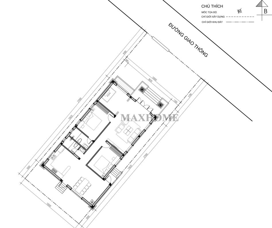 Về vị trí và quy mô, công trình nằm theo hướng Tây Bắc, với kích thước mặt bằng 9,3 x 19,4m, mang đến tỷ lệ không gian cân đối và thông thoáng. Tổng diện tích sử dụng khoảng 140m² được các kiến trúc sư tính toán kỹ lưỡng nhằm tối ưu công năng, đảm bảo sự rộng rãi trong sinh hoạt mà vẫn giữ được tính gọn gàng, hài hòa. Cách bố trí mặt bằng hợp lý giúp ngôi nhà đón gió, ánh sáng tự nhiên hiệu quả, đồng thời tạo điều kiện kết nối linh hoạt với không gian sân vườn xung quanh, nâng cao chất lượng sống.