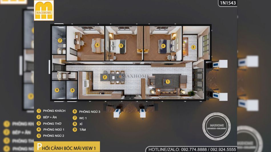 Khu vực bếp 23m2 được thiết kế rộng rãi kết hợp bàn đảo và bàn ăn tại chỗ rất tiện lợi và tối ưu công năng trong quá trình nấu nướng. Ba phòng ngủ đồng diện tích 14m2 được bố trí cạnh nhau giúp mỗi thành viên có không gian riêng tư và thoải mái. Phía cuối nhà bố trí khu vực vệ sinh chung gần các phòng ngủ để tiện sử dụng, riêng phòng ngủ 03 có nhà vệ sinh riêng bên trong.