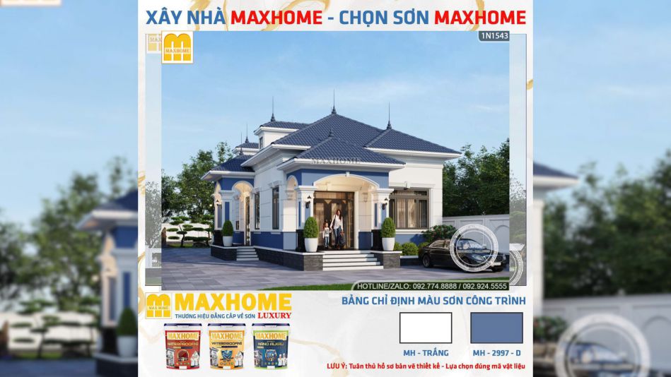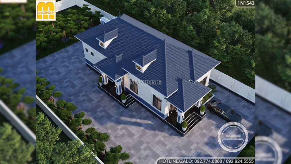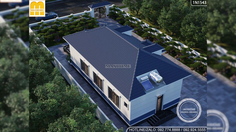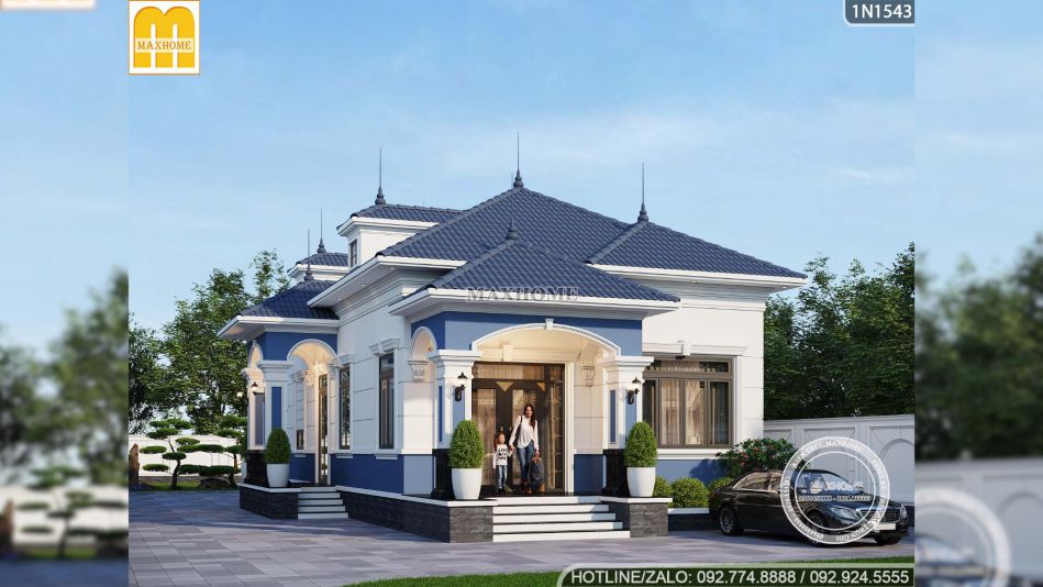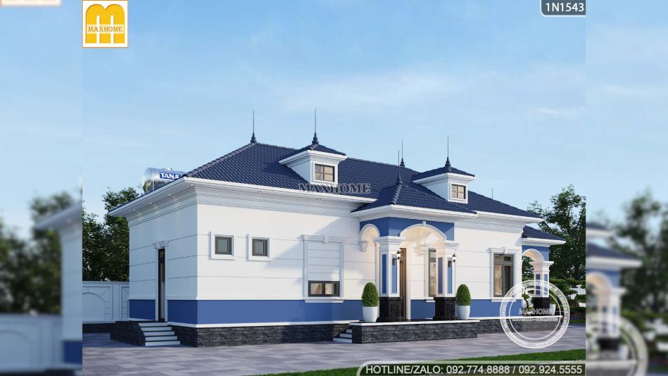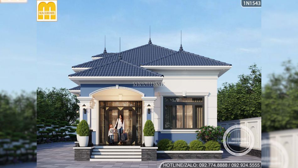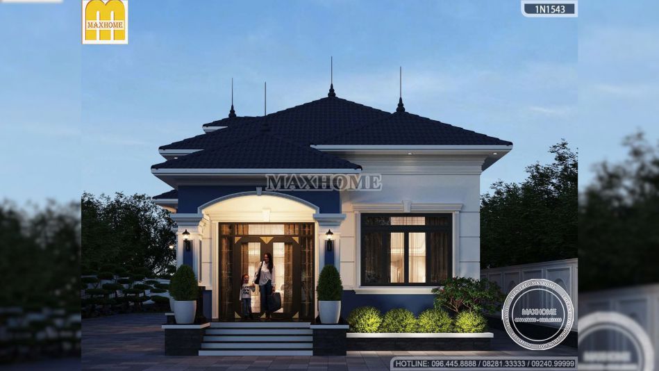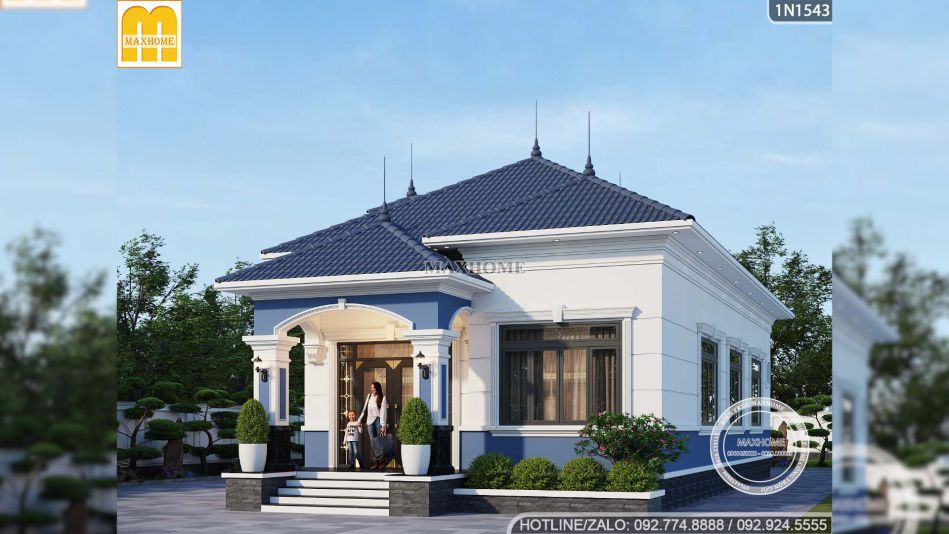 Ngay từ phần ngoại thất, ngôi nhà vườn 1 tầng đã tạo ấn tượng mạnh nhờ phong cách tân cổ điển nhẹ nhàng, tinh tế và cực kỳ phù hợp với những gia đình muốn một không gian sống vừa hiện đại vừa có chiều sâu. Điểm cuốn hút đầu tiên của mẫu nhà đẹp này chính là sự kết hợp màu sắc rất hợp lý. Tông trắng chủ đạo kết hợp cùng màu xanh đặc trưng của Maxhome giúp tổng thể trông nổi bật mà không quá phô trương.