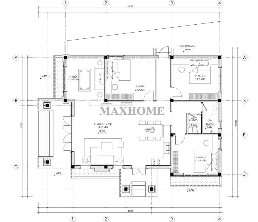 Khu vực bàn thờ được bố trí khéo léo về phía bên phải ngôi nhà, vừa đảm bảo sự trang nghiêm, tôn kính trong thờ cúng, vừa thuận tiện cho sinh hoạt hằng ngày. Ba phòng ngủ được sắp xếp gọn gàng theo bố cục hình chữ L, đảm bảo sự riêng tư và yên tĩnh, trong khi khu vực phòng tắm và nhà vệ sinh chung đặt ở vị trí trung tâm giúp việc sử dụng trở nên thuận tiện, đáp ứng đầy đủ nhu cầu sinh hoạt của cả gia đình.
