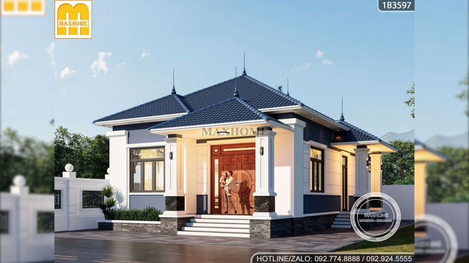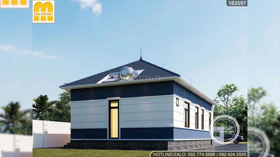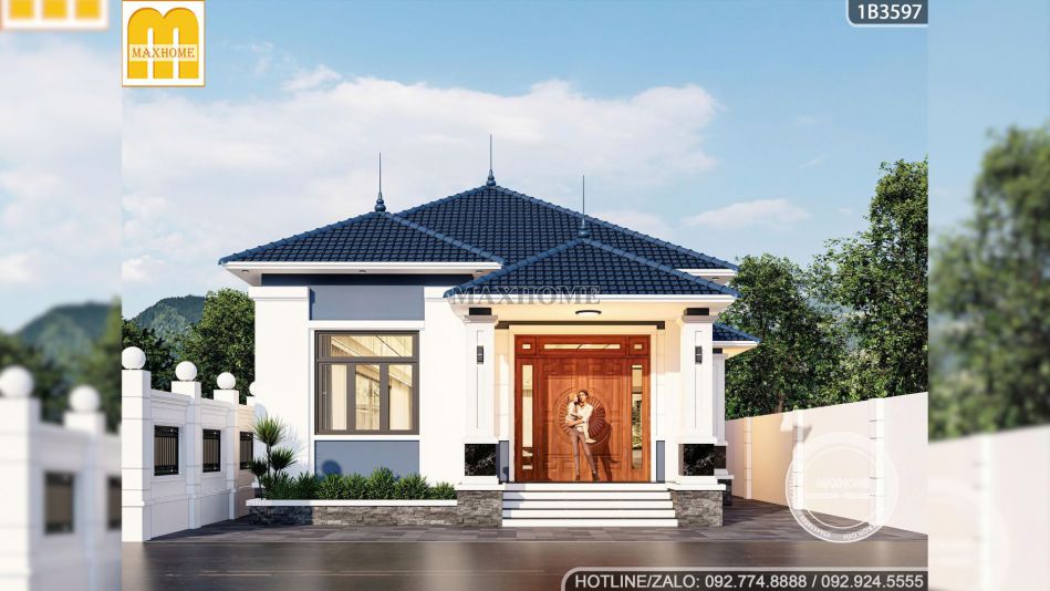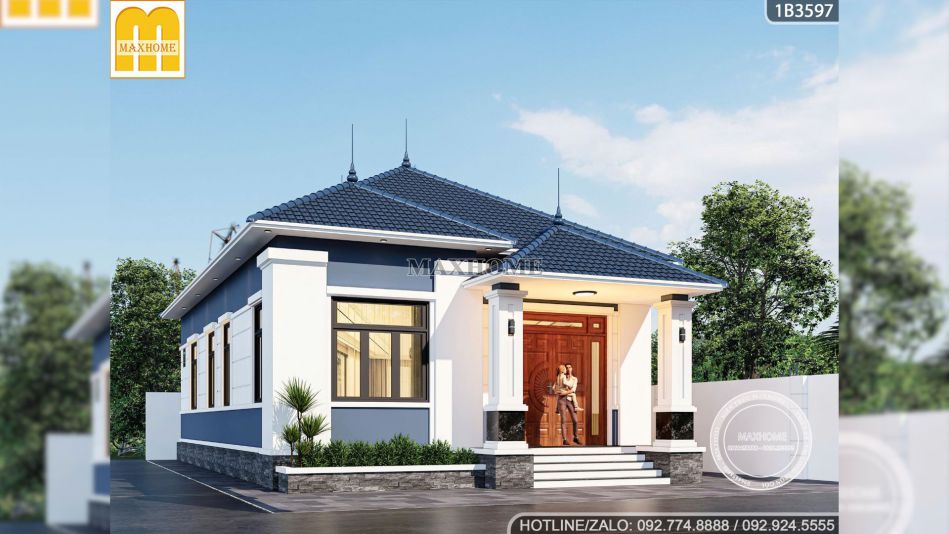 Căn nhà của anh Thuận được Maxhome khắc họa lên một bức tranh tinh tế, sử dụng màu sơn trắng tuy trông đơn giản nhưng lại làm nổi bật các chi tiết ngoại thất khác khiến cho bản vẽ nhà cấp 4 này càng trở nên đắt giá. Bên cạnh đó là màu sơn xanh dương dịu nhẹ để tạo nên một tổng thể hài hòa giúp ngôi nhà trở nên nổi bật nhưng vẫn giữ được sự gần gũi với cảnh quan xung quanh.