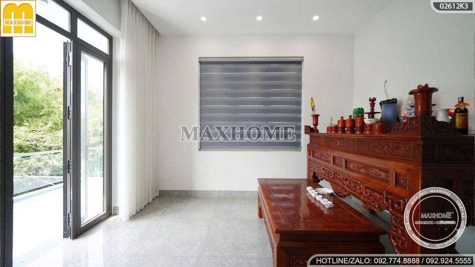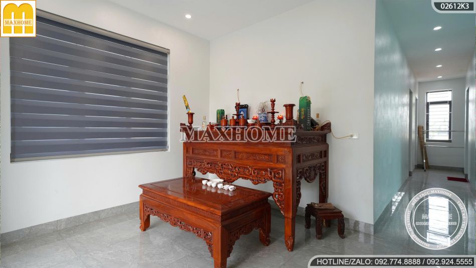Tại tầng 2, phòng thờ được đặt ở vị trí trang trọng, hài hòa về phong thủy, nhằm đảm bảo sự cân bằng năng lượng trong không gian sống. Bàn thờ làm từ gỗ tự nhiên cao cấp, toát lên vẻ sang trọng nhưng vẫn giữ được nét văn hóa tâm linh truyền thống của người Việt.