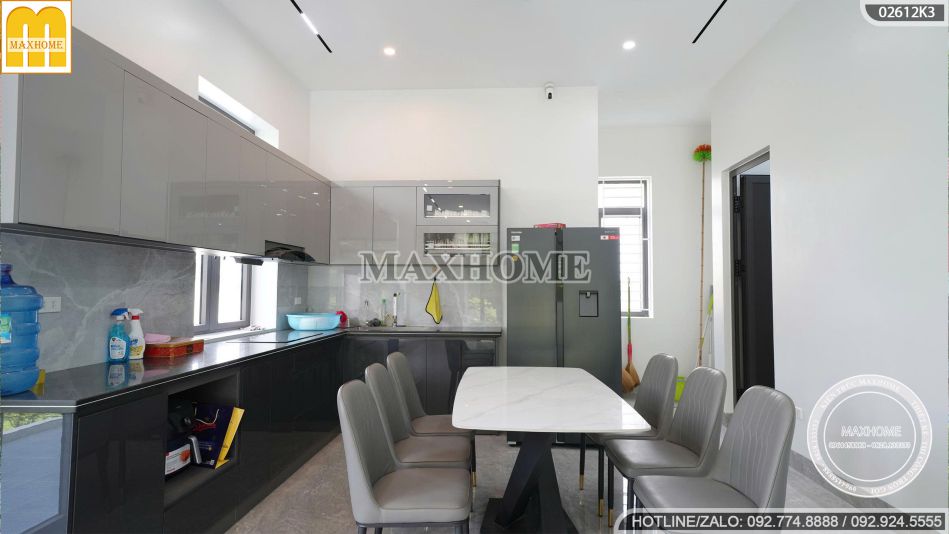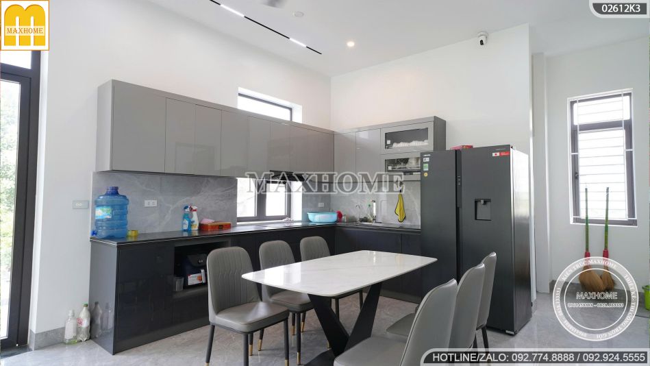 Phòng bếp được thiết kế tinh tế, mang phong cách hiện đại và thời thượng với gam màu chủ đạo trắng – ghi đầy trang nhã. Sự kết hợp hài hòa giữa tủ bếp, bàn ăn màu ghi và nền tường trắng giúp không gian trở nên sáng sủa, rộng rãi và luôn giữ được cảm giác sạch sẽ, sang trọng. Mặt bàn bếp được ốp đá cao cấp có độ bền cao, khả năng chống trầy xước và chịu nhiệt tốt, vừa đảm bảo tính thẩm mỹ vừa nâng cao sự tiện nghi trong sinh hoạt hằng ngày.