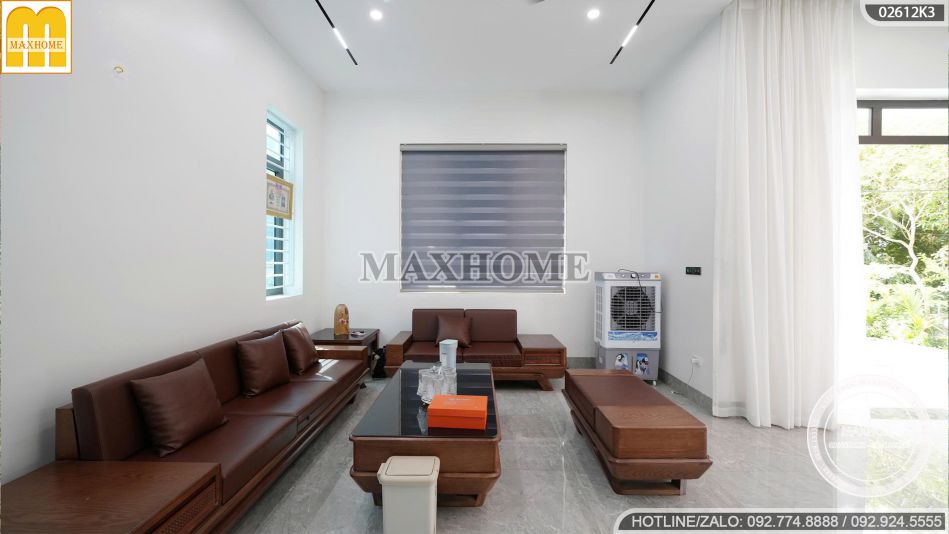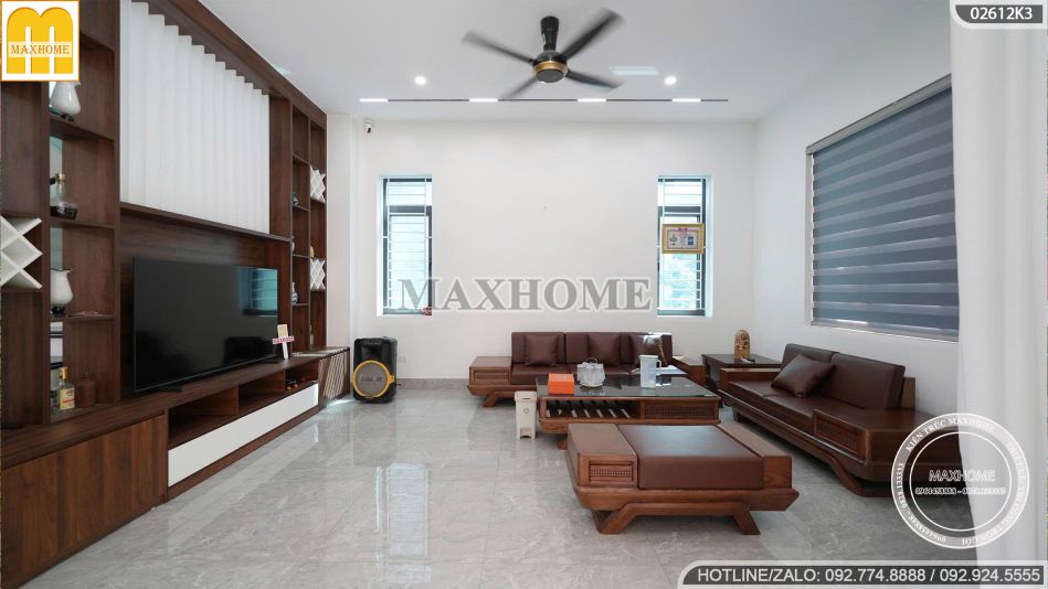 Sắc trắng mang đến cảm giác nhẹ nhàng, thanh thoát, giúp tôn lên đường nét kiến trúc tinh gọn; trong khi gam nâu gợi nên sự ấm áp, gần gũi và bền vững. Điểm nhấn ghi xám được sử dụng khéo léo để tạo chiều sâu thị giác, đồng thời thể hiện sự trẻ trung, năng động và gu thẩm mỹ thời thượng của gia chủ.