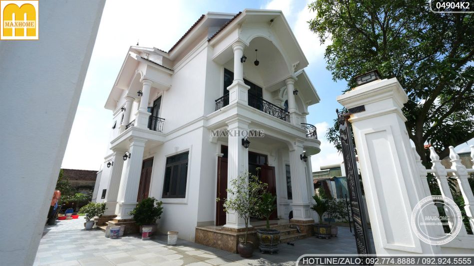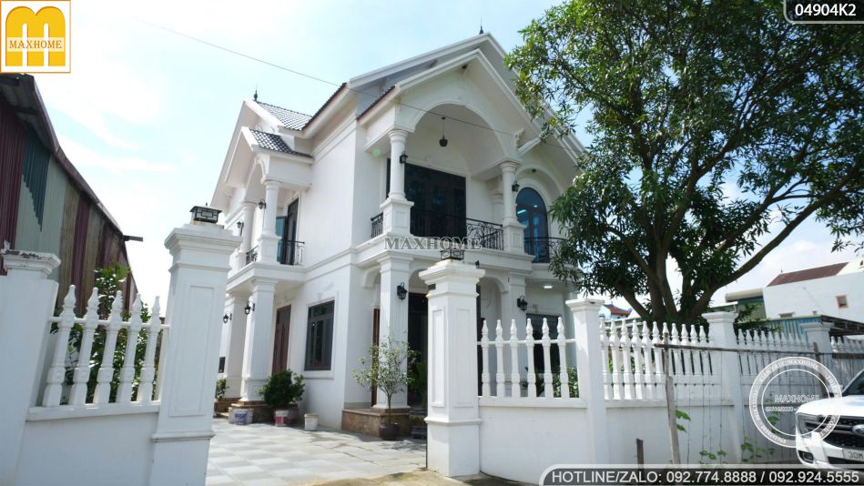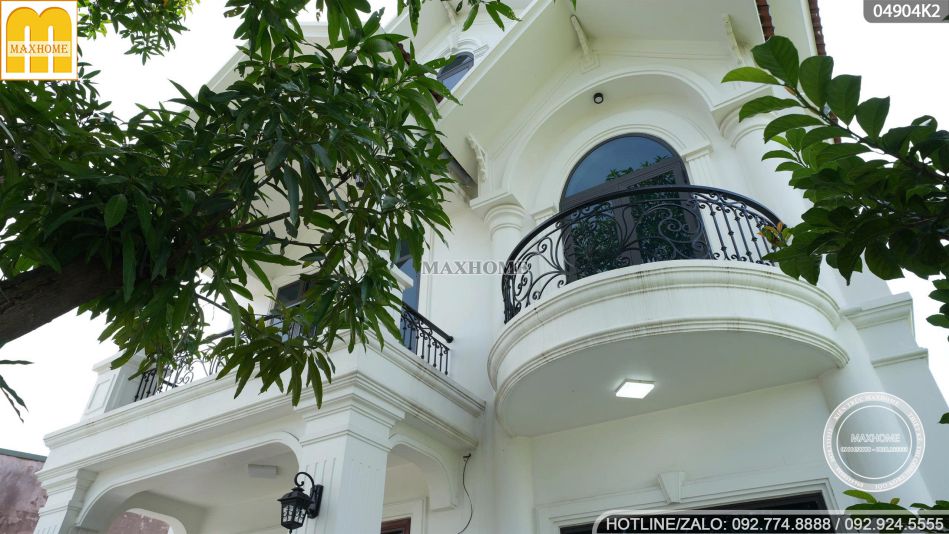 Ngôi nhà 2 tầng mái Thái của anh Tuân mang phong cách tân cổ điển nhẹ nhàng. Nhìn từ xa, mặt tiền nổi bật với hệ phào chỉ tinh xảo, các đường nét mềm mại tạo cảm giác thanh thoát mà vẫn vững chãi. Vòm sảnh cong nhẹ và hai cột vuông nâng đỡ ban công tạo nên điểm nhấn duyên dáng cho toàn bộ ngôi nhà. Tất cả được phủ lớp sơn trắng tinh khôi được coi là gam màu tượng trưng cho sự thanh lịch và bền vững với thời gian.