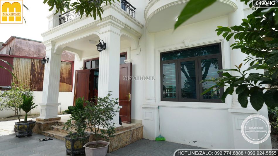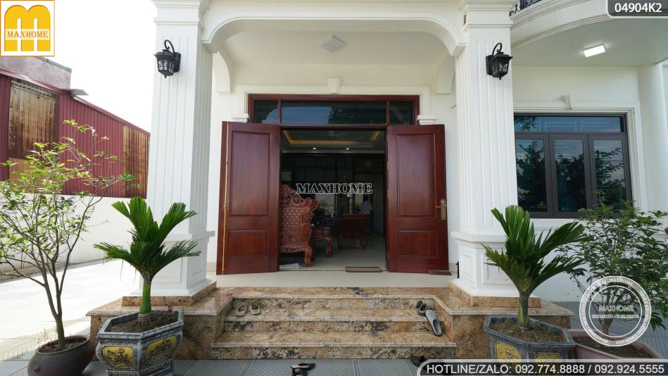 Diện tích một mặt sàn là 120m2, không tính phần bếp phụ phía sau, quy mô rộng rãi và được bố trí thông minh khiến ngôi nhà 2 tầng mái Thái này trở nên sang trọng và tiện nghi. Sảnh chính uy nghi với bậc tam cấp ốp đá vàng, bên cạnh là sảnh phụ được thiết kế hài hòa không kém giúp việc đi lại, tổ chức cỗ bàn thuận tiện hơn. Cửa chính và cửa phụ đều làm từ gỗ Lim Nam Phi bền màu và chắc chắn. Đặc biệt, ở vị trí cửa chính, Maxhome còn khéo léo bố trí hai ô kính lấy sáng khiến căn nhà 2 tầng luôn tràn ngập ánh nắng tự nhiên ngay cả khi đóng cửa.