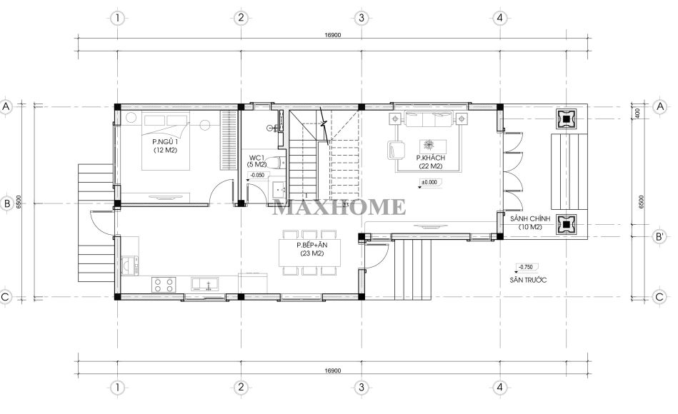 Bước vào từ cửa chính, ta sẽ bắt gặp phòng khách rộng khoảng 22m², được thiết kế thông thoáng với hệ cửa kính lớn giúp tận dụng tối đa ánh sáng tự nhiên. Không gian này là nơi đón tiếp khách và sum họp gia đình, được bố trí nội thất hiện đại, tinh gọn nhưng vẫn toát lên vẻ sang trọng và ấm cúng. Tiếp nối phòng khách là khu vực bếp và phòng ăn, được thiết kế nối liền theo chiều dài ngôi nhà,