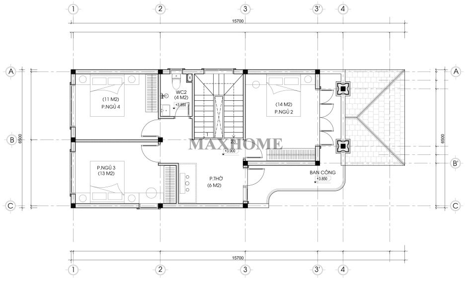 Tiếp theo là không gian phòng thờ được thiết kế nhỏ gọn, hướng ra ban công thoáng mát, mang lại cảm giác trang nghiêm và yên tĩnh cho khu vực thờ cúng. Ba phòng ngủ được bố trí hợp lý xung quanh, đảm bảo sự riêng tư và thuận tiện trong sinh hoạt cho các thành viên trong gia đình. Cuối cùng là một nhà vệ sinh chung được sắp xếp khoa học, đầy đủ tiện nghi, giúp tối ưu diện tích sử dụng của ngôi nhà.