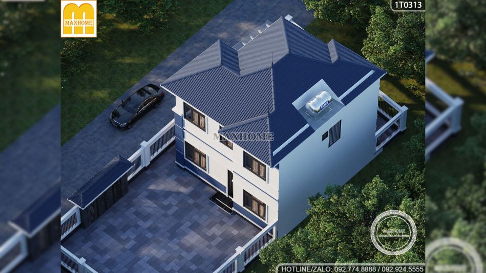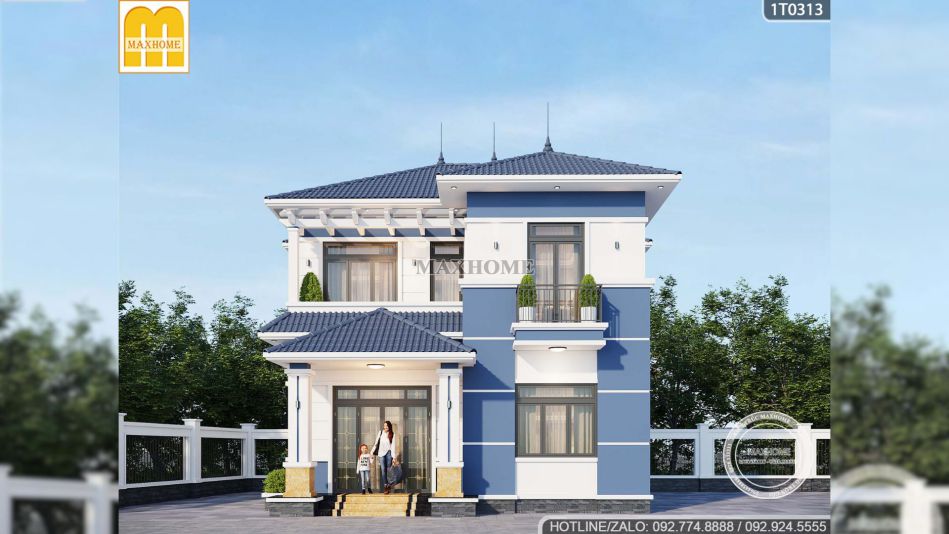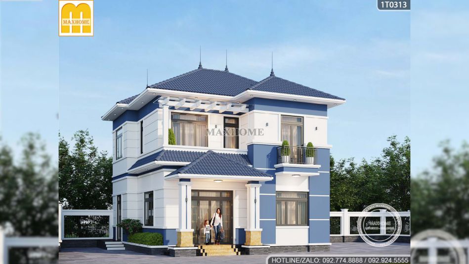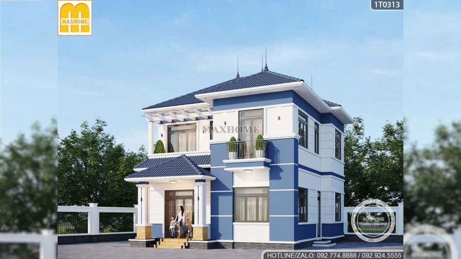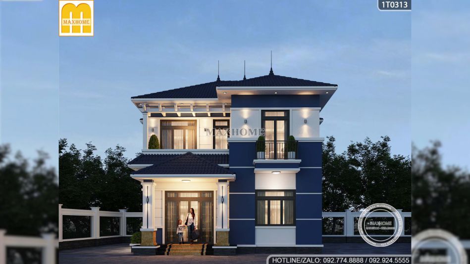 Về màu sắc, Maxhome đã khéo léo lựa chọn hai tông màu chủ đạo là xanh navy và trắng sứ để bao phủ lên toàn bộ công trình. Sự kết hợp giữa sắc xanh trầm ấm, thanh lịch và sắc trắng tinh khôi tạo nên một diện mạo trẻ trung nhưng không kém phần uy nghiêm. Tuy nhiên, Maxhome cũng rất tinh ý khi sử dụng màu vàng của chân cột và bậc thềm làm điểm nhấn tương phản để giúp mặt tiền ngôi nhà trở nên nổi bật và có sức sống hơn giữa không gian xanh của sân vườn.