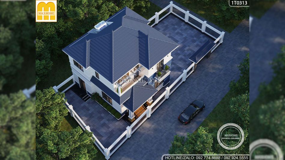 Kết thúc trọn vẹn bản giao hưởng kiến trúc này chính là hệ mái Nhật màu xanh thẫm vốn luôn là sự lựa chọn ưu tiên của các chủ đầu tư tại Việt Nam. Dù là nhà thấp tầng hay cao tầng, mái Nhật vẫn giữ được sức hút nhờ độ dốc vừa phải giúp thoát nước mưa nhanh chóng và khả năng chống nóng tuyệt vời cho không gian nội thất. Toàn bộ tổng thể từ hình khối, màu sắc cho đến vật liệu đã tạo nên một công trình hoàn mỹ, đáp ứng đầy đủ tiêu chí về một mẫu nhà 2 tầng 4 phòng ngủ đẹp mà bất cứ gia đình nào cũng hằng mơ ước trong năm mới 2026 này.