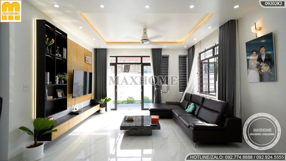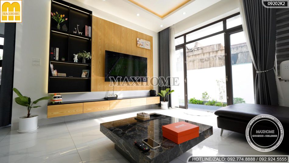 Ánh sáng tự nhiên chan hòa qua hệ cửa kính lớn giúp không gian thêm rộng mở, thoáng sáng và tràn đầy sức sống. Mỗi chi tiết, từ trần thạch cao giật cấp viền đèn LED cho đến kệ trang trí gỗ kết hợp đèn âm tường, đều góp phần tạo nên một không gian tiếp khách sang trọng, cuốn hút và đầy cảm xúc.
