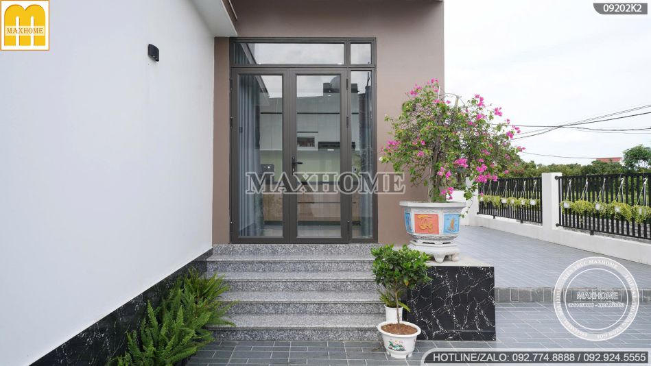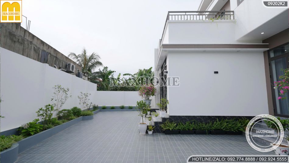 Bao quanh ngôi nhà là khuôn viên sân vườn xanh mát, được chăm chút tỉ mỉ với những chậu cây cảnh và khóm hoa rực rỡ, mang đến vẻ đẹp sinh động và tràn đầy sức sống. Toàn bộ khu sân được lát gạch chống trơn màu ghi nhã nhặn, vừa sạch sẽ vừa tôn lên nét hiện đại của không gian ngoại thất.