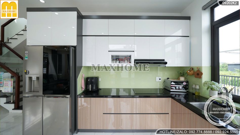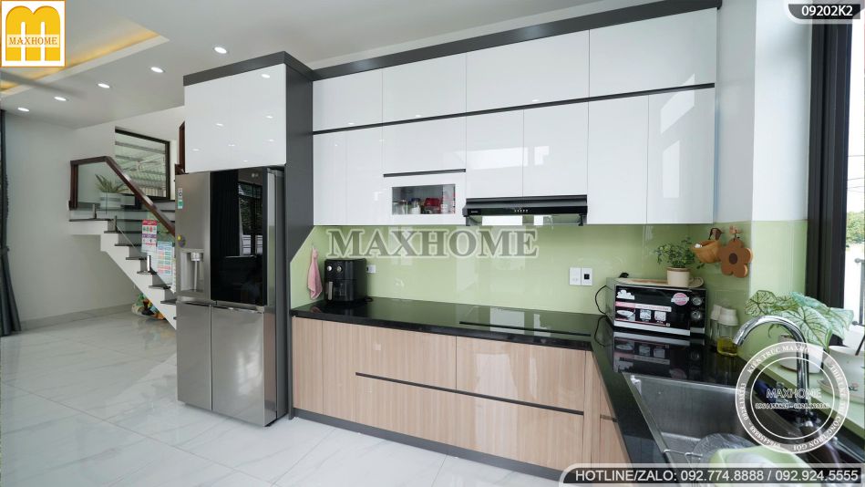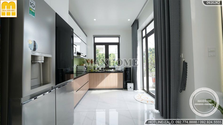 Thiết kế mở với lối đi ra sảnh phụ giúp căn bếp luôn thông thoáng, tràn đầy năng lượng tích cực. Mỗi chi tiết đều được bố trí hợp lý, vừa đảm bảo thẩm mỹ vừa tối ưu công năng, biến nơi đây thành “trái tim” ấm cúng của ngôi nhà.