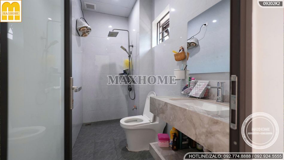 Phòng vệ sinh thiết kế hiện đại với gam màu trung tính trang nhã mang lại cảm giác sạch sẽ và dễ chịu. Khu vực rửa mặt và tắm được bố trí khoa học, tách biệt khô – ướt rõ ràng, đảm bảo tiện nghi tối đa trong sinh hoạt. Chất liệu đá và gạch ốp cao cấp kết hợp cùng ánh sáng tự nhiên giúp không gian thêm thoáng sáng, tạo cảm giác thư giãn.