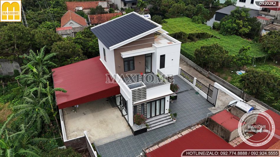 Hệ mái lệch của ngôi nhà 2 tầng là điểm nhấn kiến trúc đầy cuốn hút, mang đến diện mạo hiện đại và năng động cho tổng thể công trình. Độ chênh tinh tế giữa các khối mái không chỉ tạo hiệu ứng thẩm mỹ ấn tượng mà còn giúp công trình trở nên cao ráo, thoáng đãng hơn.