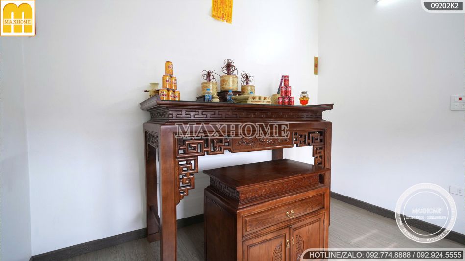 Bàn thờ được làm từ gỗ tự nhiên, với những hoa văn chạm khắc tinh tế, vừa thể hiện sự chỉn chu vừa giữ gìn trọn vẹn nét văn hóa truyền thống của người Việt.