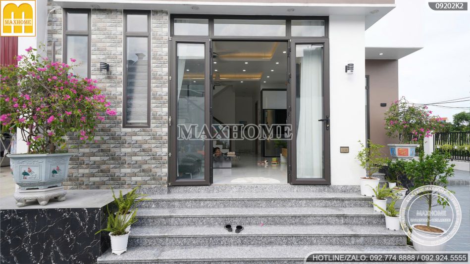 Mặt tiền được nhấn mạnh bằng mảng tường ốp đá, cửa kính khung nhôm đen sang trọng cùng hệ bậc tam cấp ốp đá granite, tất cả tạo nên một tổng thể ngoại thất đẳng cấp, hiện đại và đầy cuốn hút. Đây là lựa chọn hoàn hảo cho những gia đình mong muốn sở hữu một không gian sống tinh tế và đầy đủ tiện nghi.