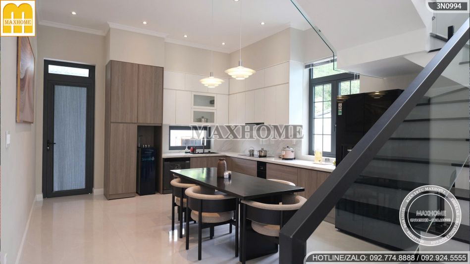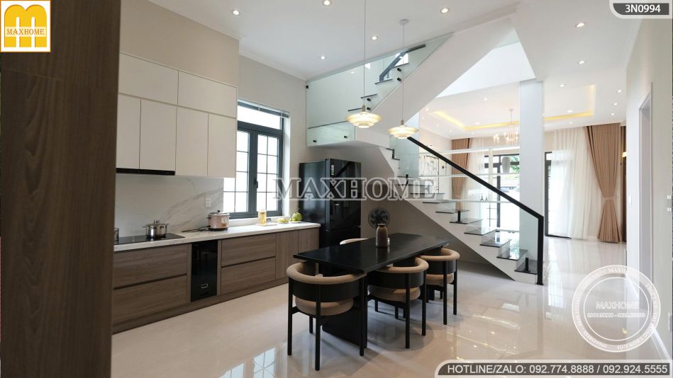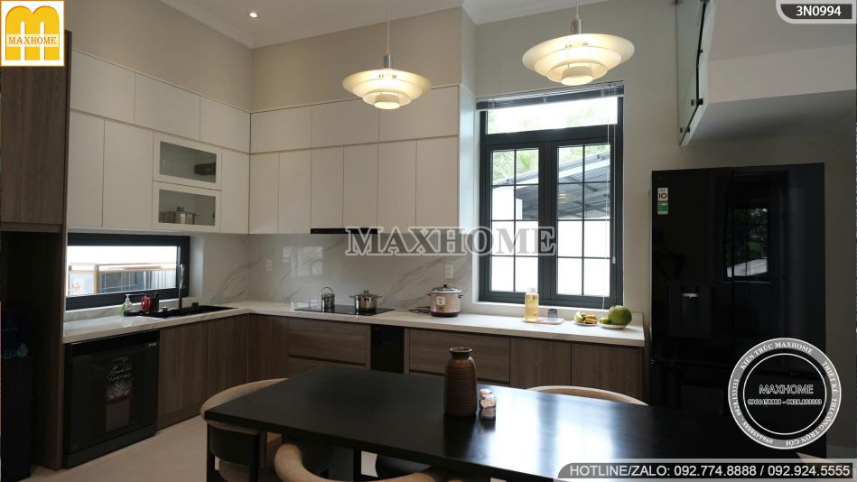 Không gian phòng bếp được thiết kế hiện đại, tinh tế và đầy tiện nghi, mang lại cảm giác ấm cúng nhưng vẫn toát lên vẻ sang trọng. Hệ tủ bếp chữ L sử dụng chất liệu gỗ công nghiệp cao cấp với tông màu nâu – trắng phối hợp hài hòa, vừa sạch sẽ, vừa tạo chiều sâu cho không gian.