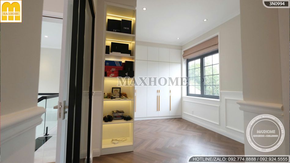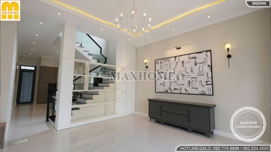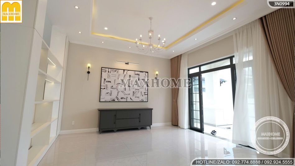 Sàn nhà lát gạch đá hoa trắng bóng mịn không chỉ giúp mở rộng thị giác mà còn tăng độ sáng, độ phản chiếu cho căn phòng. Bên cạnh đó, các kệ gỗ trang trí được bố trí khéo léo vừa tạo điểm nhấn thẩm mỹ, vừa giúp không gian thêm tiện nghi và thể hiện gu thẩm mỹ tinh tế của gia chủ.