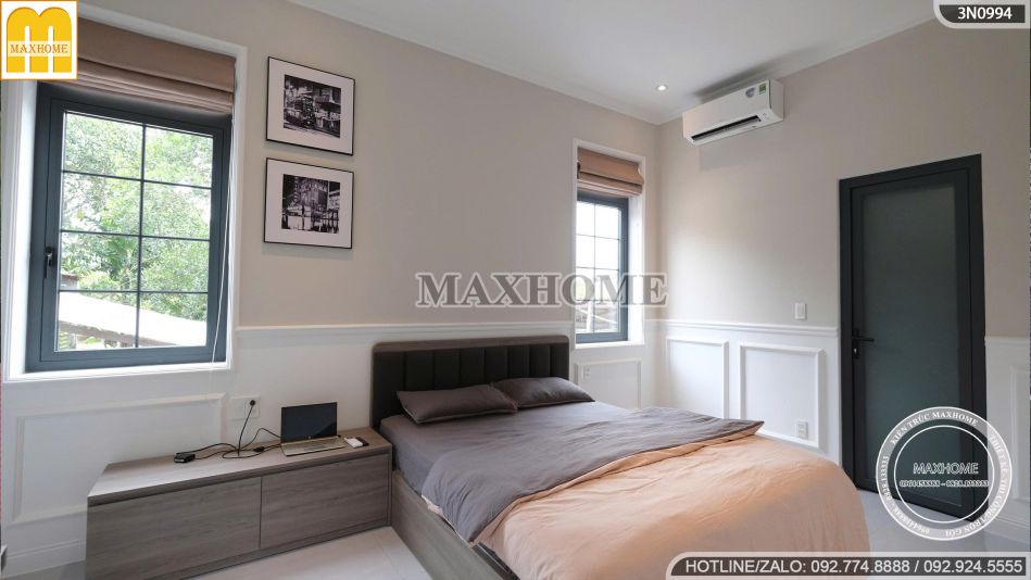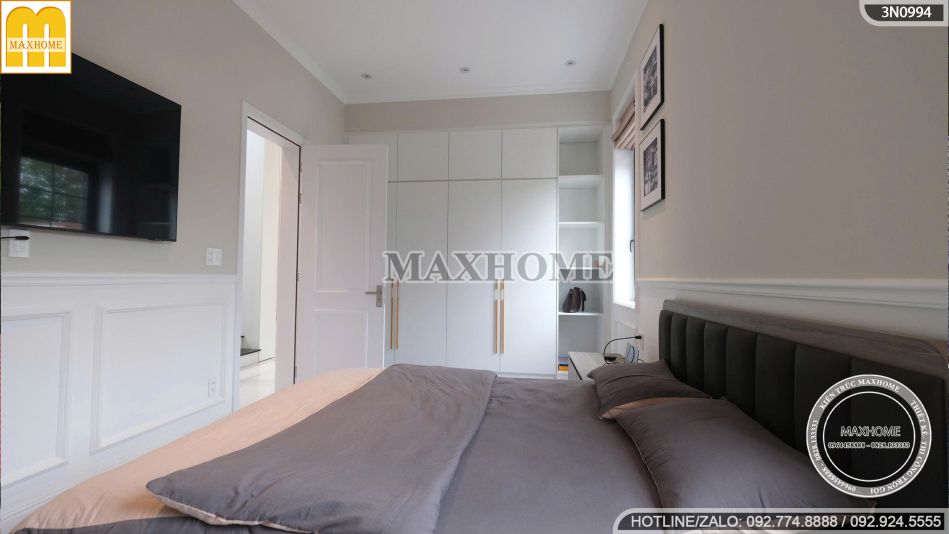 Phòng ngủ mang vẻ đẹp ấm cúng, thanh lịch và đầy tiện nghi, được thiết kế với tông màu trung tính làm chủ đạo, tạo cảm giác thư giãn và dễ chịu. Giường ngủ gỗ kết hợp cùng bộ chăn ga màu ghi – be hài hòa, mang đến sự tinh tế mà không kém phần sang trọng.