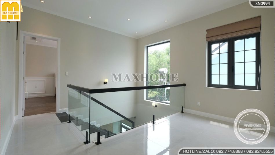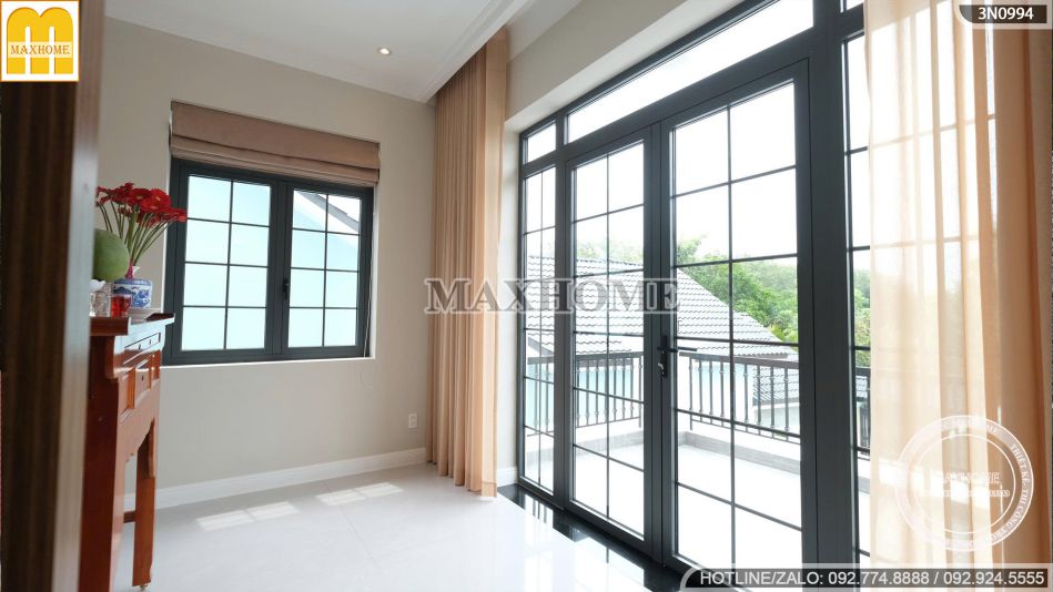 Bậc tam cấp ốp đá tự nhiên sang trọng dẫn lên sảnh đón uy nghi, tôn thế cao ráo và bề thế cho toàn bộ công trình. Hệ cửa sổ nhôm Xingfa kết hợp kính cường lực được bố trí hài hòa trên các mảng tường, tạo điểm nhấn hiện đại và cân đối cho kiến trúc. Nhờ chất liệu cao cấp, cửa sổ có độ bền cao, cách âm – cách nhiệt tốt và đón trọn ánh sáng tự nhiên, mang đến không gian sống thoáng đãng, tràn đầy sinh khí.