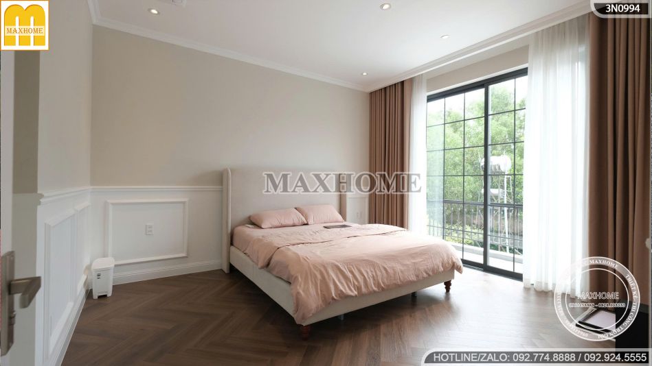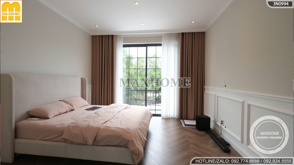 Giường ngủ bọc nệm lớn với thiết kế mềm mại giúp gia chủ tận hưởng trọn vẹn những phút giây nghỉ ngơi. Sàn gỗ xương cá sang trọng kết hợp ánh sáng tự nhiên tràn qua khung cửa kính lớn hướng ra ban công, khiến căn phòng luôn sáng sủa, thoáng đãng và gần gũi với thiên nhiên.
