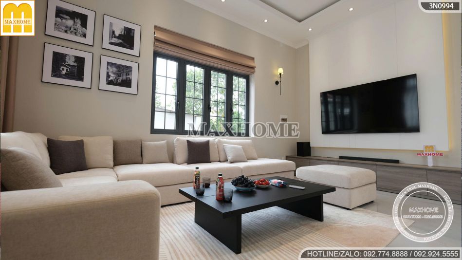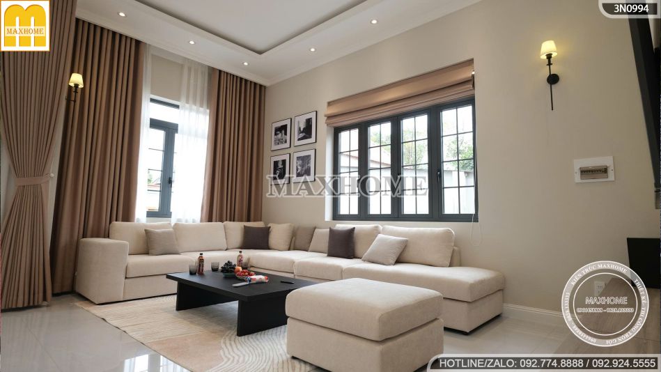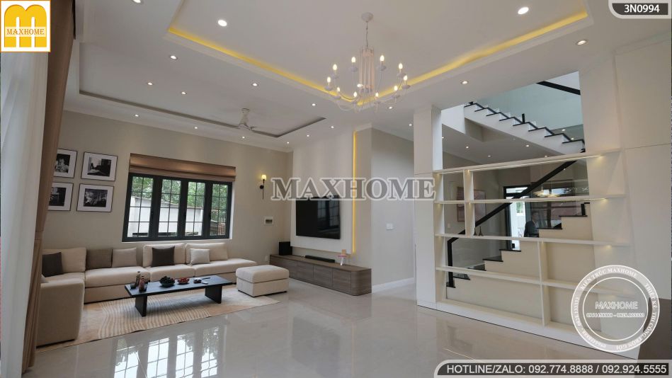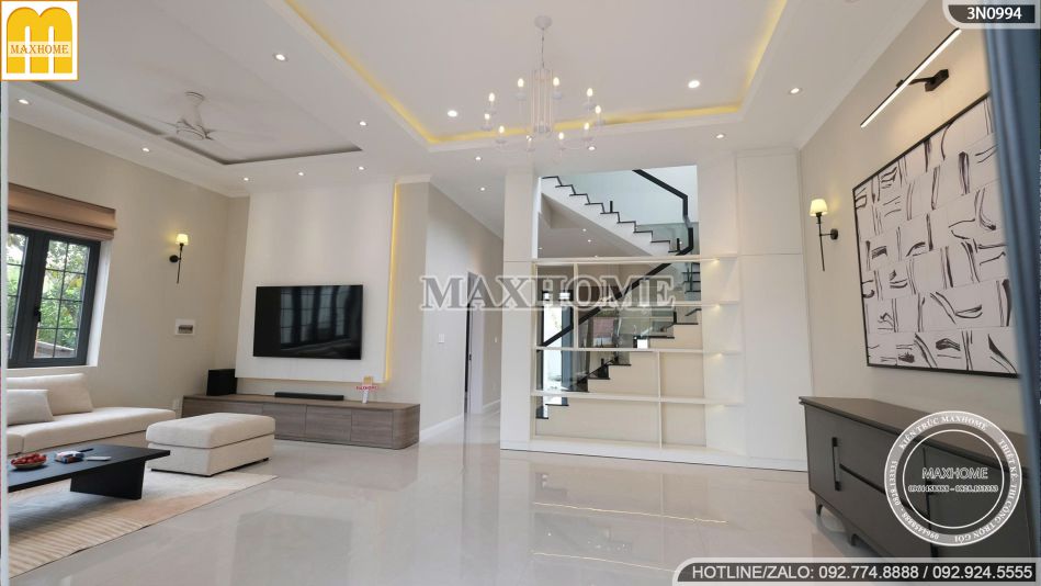 Bộ sofa chữ L bọc nỉ êm ái, chiếc bàn trà tối giản, cùng bức tường trang trí nghệ thuật và hệ đèn trần tinh xảo tạo nên tổng thể hài hòa, vừa hiện đại vừa thanh lịch. Đây không chỉ là nơi đón tiếp khách quý mà còn là trái tim của ngôi nhà, thể hiện rõ nét phong cách sống sang trọng và chuẩn mực của gia đình anh Đạt.