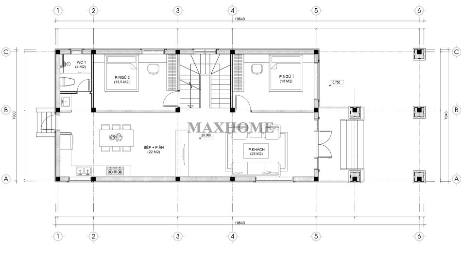 Từ sảnh chính bước vào, không gian phòng khách được bố trí rộng rãi, thông thoáng, là nơi sinh hoạt chung và tiếp đón khách của gia đình. Tiếp nối phía trong là khu vực bếp kết hợp phòng ăn được sắp xếp về cuối nhà, đảm bảo sự gọn gàng, thuận tiện trong quá trình sử dụng và hạn chế mùi ảnh hưởng đến các không gian khác. Tại tầng 1, hai phòng ngủ được bố trí đối diện nhau, tạo sự cân đối và thuận tiện cho sinh hoạt hằng ngày. Cuối nhà là một nhà vệ sinh chung, được đặt ở vị trí kín đáo, phục vụ nhu cầu sử dụng cho toàn bộ tầng.
