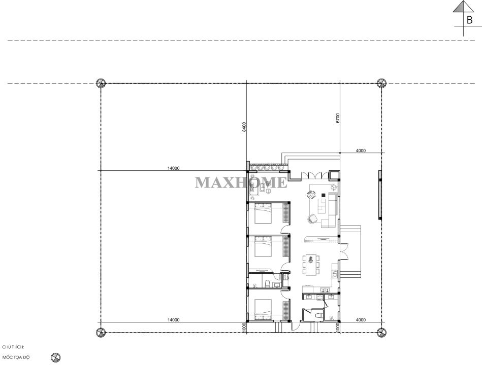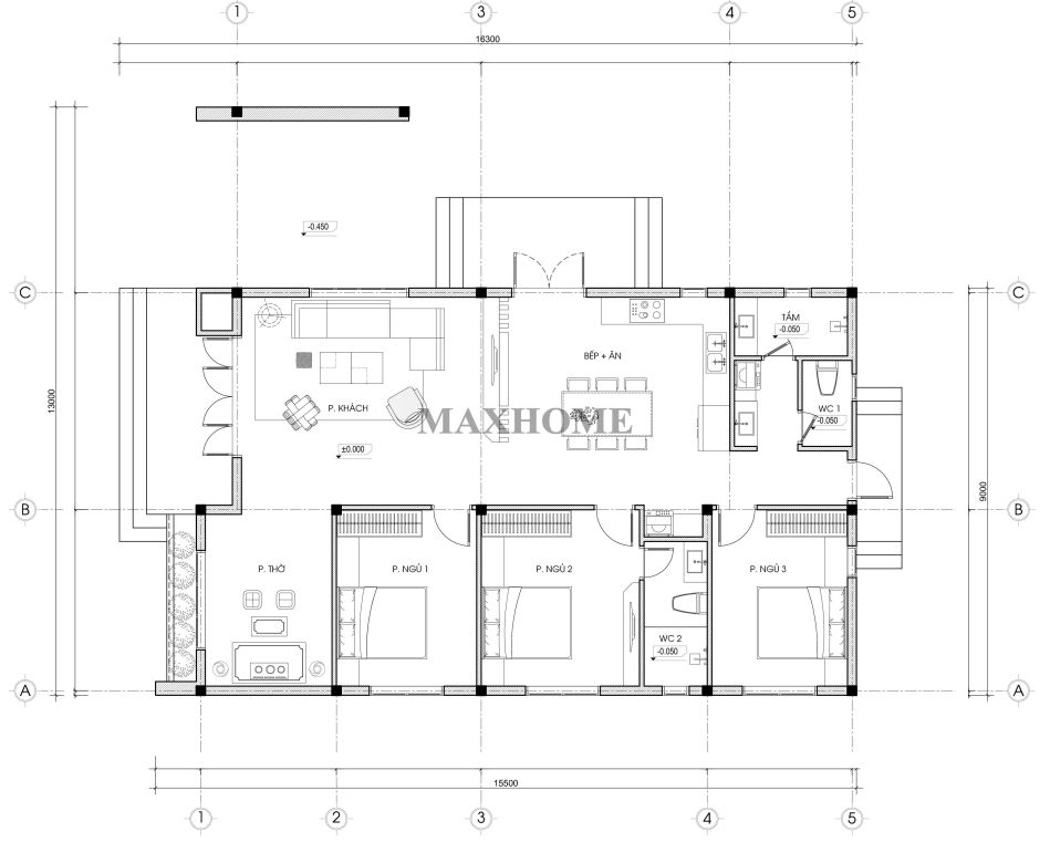 Công trình nhà 1 tầng mái bằng được thiết kế theo hướng Bắc, phù hợp với điều kiện khí hậu nhiệt đới, giúp đón gió mát và hạn chế ánh nắng gay gắt vào mùa hè. Ngôi nhà có kích thước 13 x 16,3m, tổng diện tích sử dụng khoảng 136m², được quy hoạch hợp lý để đảm bảo không gian sinh hoạt thoải mái cho các thành viên trong gia đình. Với diện tích này, kiến trúc sư dễ dàng bố trí đầy đủ công năng, đồng thời vẫn giữ được tính thẩm mỹ và sự thông thoáng trong tổng thể thiết kế.