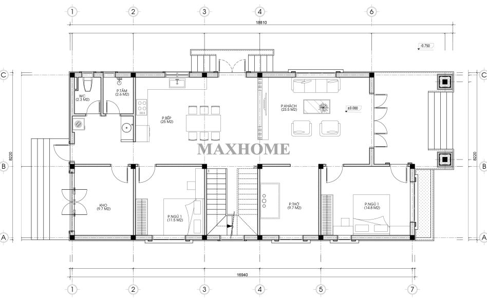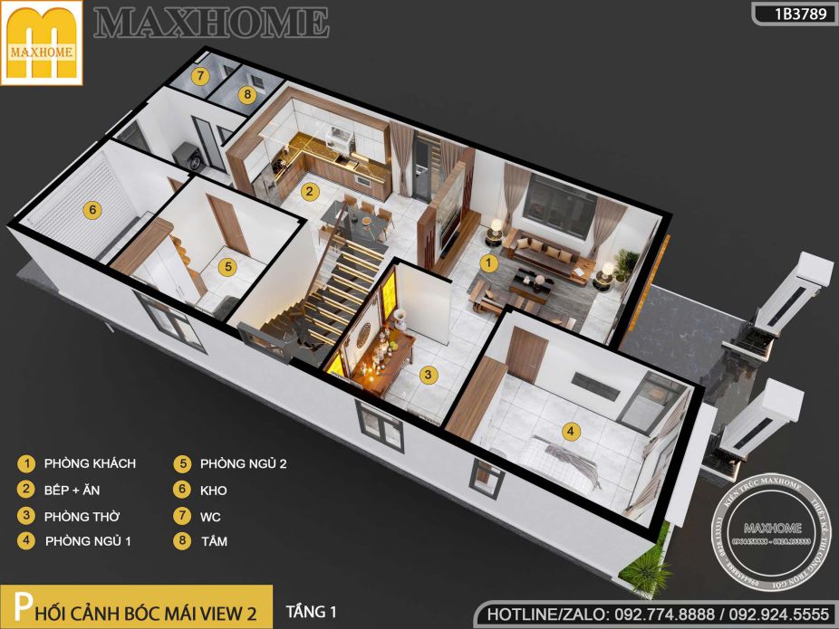 Từ sảnh chính bước vào là không gian phòng khách rộng rãi, sang trọng, được bố trí khoa học tạo cảm giác thông thoáng và dễ chịu. Kế tiếp là khu vực phòng thờ được thiết kế riêng biệt, trang nghiêm, phù hợp với phong tục thờ cúng của người Việt. Phòng bếp và khu vực ăn uống được bố trí hợp lý, có lối đi phụ ra bên hông nhà, giúp việc di chuyển và thoát mùi nấu nướng thuận tiện hơn. Ngoài ra, ngôi nhà còn có 2 phòng ngủ riêng tư, cùng phòng kho tiện dụng và khu vực nhà vệ sinh, phòng tắm đặt cuối nhà, đảm bảo sự gọn gàng, kín đáo và tiện nghi trong sinh hoạt hằng ngày.