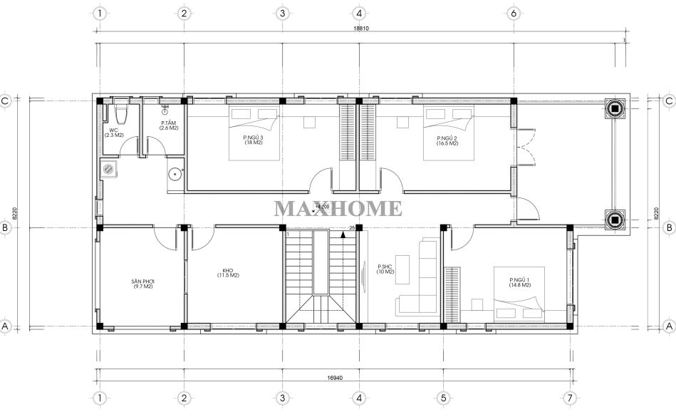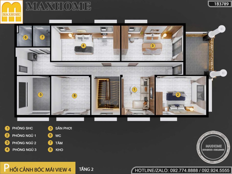 Tầng 2 được bố trí khoa học và tiện nghi, gồm phòng sinh hoạt chung rộng rãi – nơi các thành viên trong gia đình có thể thư giãn, trò chuyện và gắn kết sau những giờ làm việc, học tập. Ba phòng ngủ được sắp xếp hợp lý, đảm bảo sự riêng tư và thoải mái cho từng thành viên. Ngoài ra, tầng này còn có phòng kho nhỏ tiện lợi, khu vực sân phơi thoáng đãng giúp quần áo nhanh khô và đón nắng tự nhiên. Nhà vệ sinh và phòng tắm chung đặt ở cuối hành lang, vừa tối ưu diện tích, vừa đảm bảo tính kín đáo và thuận tiện trong quá trình sử dụng.