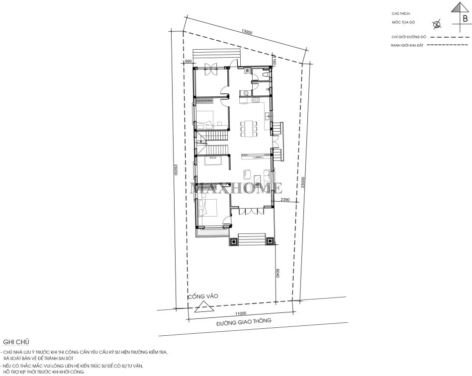 Dựa trên quá trình khảo sát thực tế kết hợp với mong muốn và phong cách sống của gia chủ, đội ngũ kiến trúc sư giàu kinh nghiệm của Maxhome đã khéo léo phân chia diện tích khu đất một cách hợp lý. Thay vì tận dụng toàn bộ để xây dựng nhà ở, kiến trúc sư chỉ bố trí một phần diện tích cho công trình chính, phần còn lại được quy hoạch làm khu sân vườn xanh mát. Thiết kế này không chỉ giúp tăng tính thẩm mỹ tổng thể, mà còn tạo nên không gian thư giãn, gần gũi với thiên nhiên, mang lại cuộc sống thoải mái và cân bằng cho gia chủ.